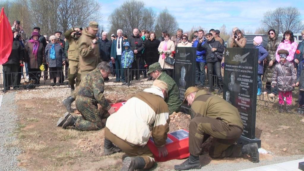 После официального открытия памятника прошла торжественная траурная церемония захоронения останков 38 солдат и офицеров Красной армии, обнаруженных в ходе поисковых работ силами поискового отряда "Находка". В том числе, экипаж самолета Пе-2, сбитого в воздушном бою 21 августа 1941г.: летчик, старший лейтенант Ахалашвили Николай Георгиевич, 1908 г.р., уроженец, г. Харьков, штурман, старший лейтенант Троценко Тихон Никифорович, 1908 г.р., уроженец Днепропетровской области, воздушный стрелок-радист, старший сержант Божков Степан Сергеевич, 1917 г.р.. уроженец Ростовской области. А также пилот самолета ИЛ-2 младший сержант Лунин Сергей Алексеевич, 1916 года рождения, уроженец Куйбышевской области. Летчикам-героям были открыты памятные плиты.