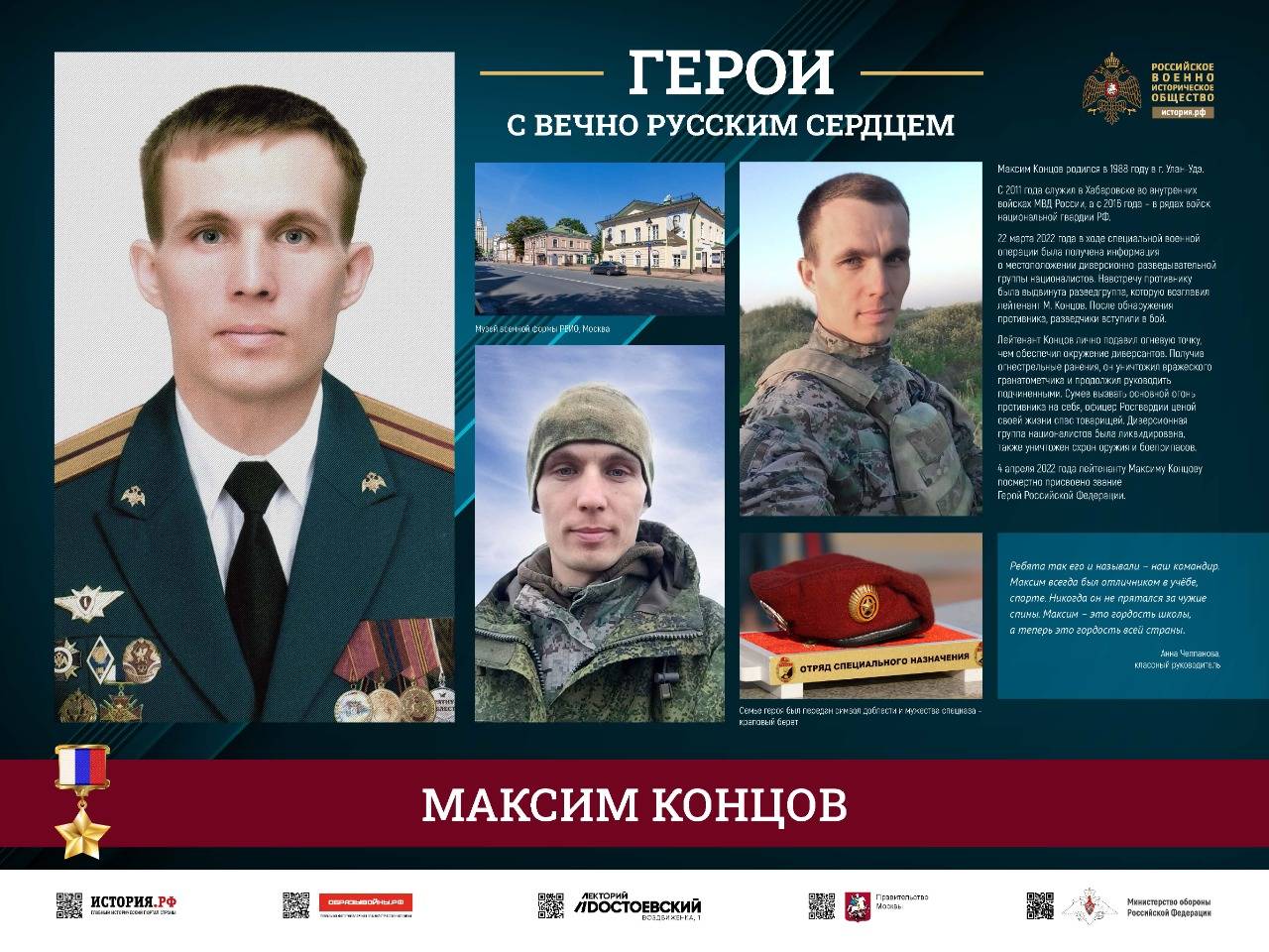 Военнослужащий Восточного округа Росгвардии лейтенант Максим Концов погиб 24 марта 2022 года, когда во главе разведгруппы атаковал отряд украинских диверсантов. Лично подавив огневую точку, он обеспечил окружение вражеской диверсионно-разведывательной группы. В холе боя Максим Концов получил несколько огнестрельных ранений, несмотря на это, сумел уничтожить вражеского гранатометчика и продолжил руководить подчиненными. Вражеские диверсанты были ликвидированы, российские бойцы захватили и уничтожили крупный схрон оружия и боеприпасов, но сам лейтенант погиб от ран. Максиму Концову посмертно присвоили звание Героя России. Также он навечно зачислен в списки личного состава отдельного батальона оперативного назначения Росгвардии. Именем Героя названа новая улица в микрорайоне Таёжный в Улан-Удэ.