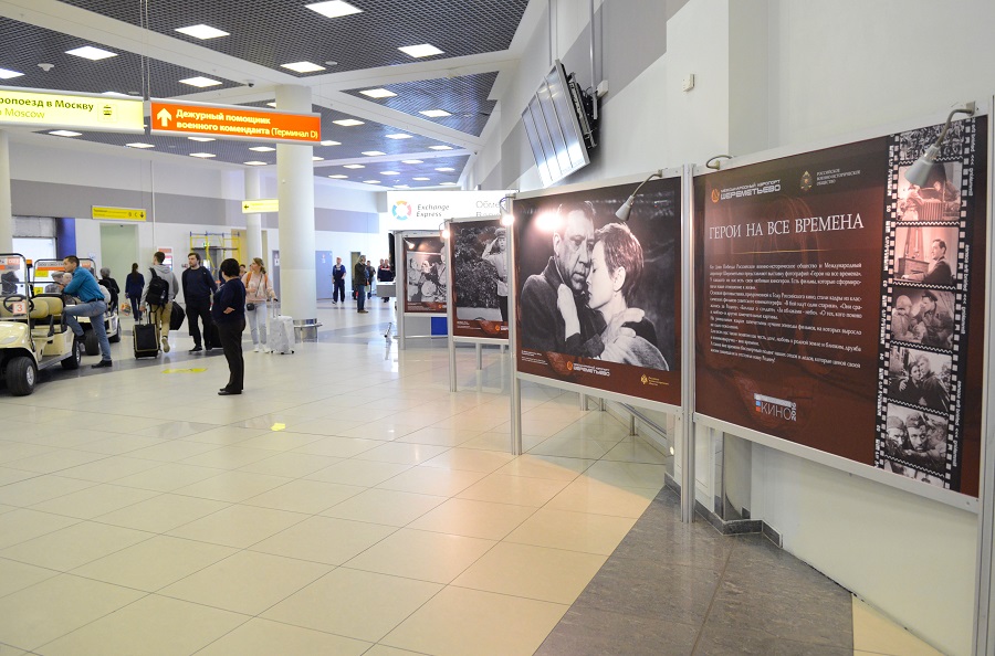 В арт-галерее терминала «E» пассажирам предлагают познакомиться с коллекцией из 14 уникальных фотокадров. В подборку вошли кинокартины: «В бой идут одни старики» Леонида Быкова, «Они сражались за Родину» Сергея Бондарчука, «Баллада о солдате» Григория Чухрая, «А зори здесь тихие…» Станислава Ростоцкого, «Семнадцать мгновений весны» Татьяны Лиозновой, «Сын полка» Василия Пронина, «Двадцать дней без войны» Алексея Германа, «Живые и мертвые» Александра Столпера и другие.