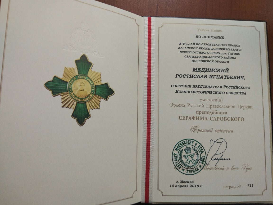 Во внимание к трудам по строительству храмов Казанской иконы Божией Матери и Всемилостивого Спаса деревни Гагино Сергиево-Посадского муниципального района Московской области Святейший Патриарх Кирилл наградил советника председателя Российского военно-исторического общества Ростислава Мединского орденом преподобного Серафима Саровского III степени.