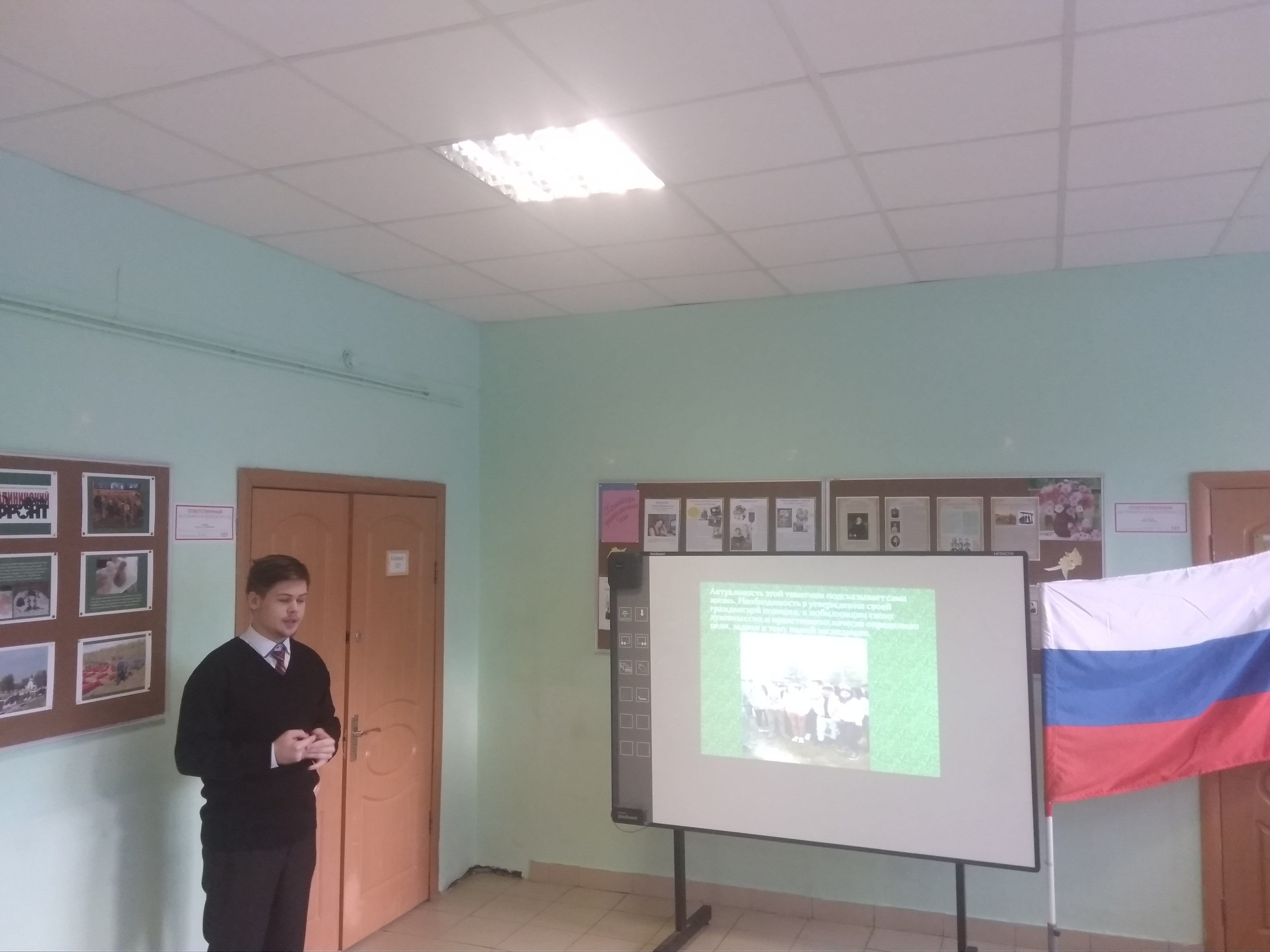 В ходе работы секции учащиеся 10 класса подготовили и представили проект «Калининский фронт, убит подо Ржевом», где рассказали о работе поисковиков и своих впечатлениях после экскурсии в лагерь поисковиков, об истории экспонатов, предоставленных школе Российским военно-историческим обществом и выставленных в школьном музее. При подготовке проекта были использованы материалы РВИО, показаны видеоролики экспедиций «Ржев. Калининский фронт».