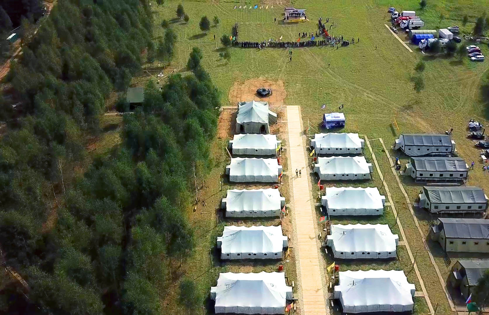 На охраняемой территории площадью около 8 га ровными рядами установлены административные и отапливаемые жилые палатки, полевая кухня, медпункт, развернуты полевые лагеря 90-го отдельного специального батальона Минобороны России и части спасателей МЧС.