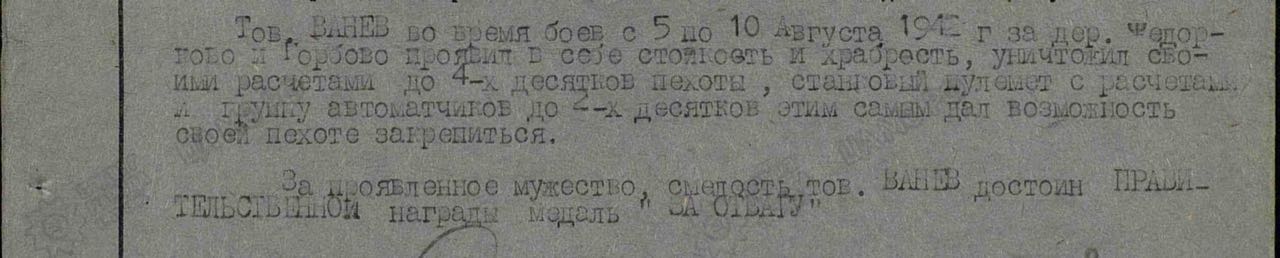 В выписке из приказа сказано: с 5 по 10 августа 1942 года у деревни Горбово шли ожесточенные бои. В них принимала участие и 379-я стрелковая дивизия, в которой служил Григорий Ванев. В этом сражении он со своими расчетами уничтожил до четырех десятков вражеской пехоты, станковый пулемет с расчетами и группу автоматчиков до двух десятков. Храбрость и стойкость офицера позволили нашей пехоте закрепиться. За проявленные мужество и смелость младший лейтенант удостоен правительственной награды – медали «За отвагу».