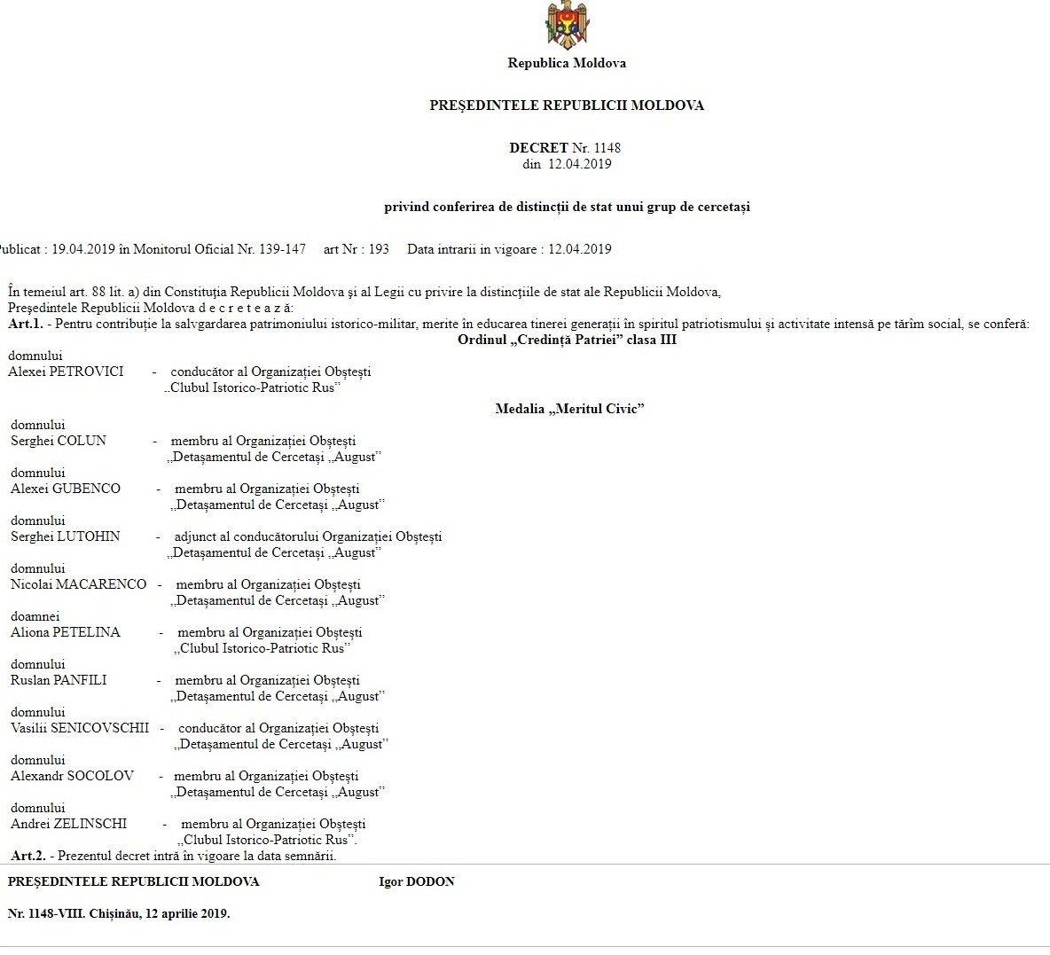 В соответствии с Указом Президента Республики Молдова № 1148 от 12 апреля 2019-го года, за вклад в сохранение военно-исторического наследия, заслуги в воспитании подрастающего поколения в духе патриотизма и активную общественную деятельность государственных наград Республики Молдова были удостоены 10 человек – членов поисковых общественных организаций «Август» и «Русский историко-патриотический клуб». Награды были вручены 25 июля 2019 года в рамках торжественной церемонии Президентом Республики Молдова Игорем Додоном.