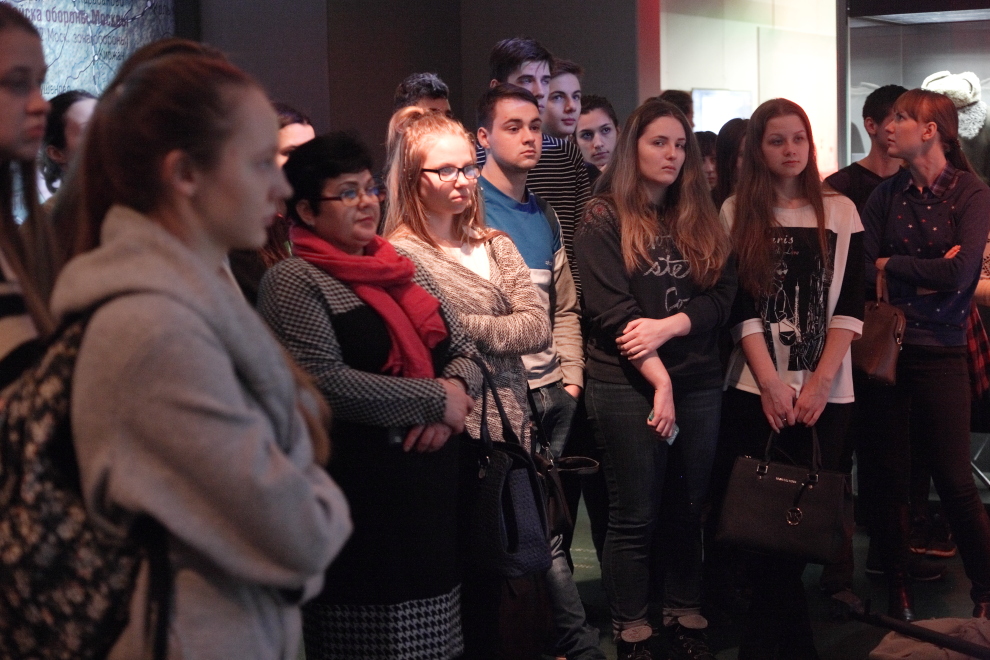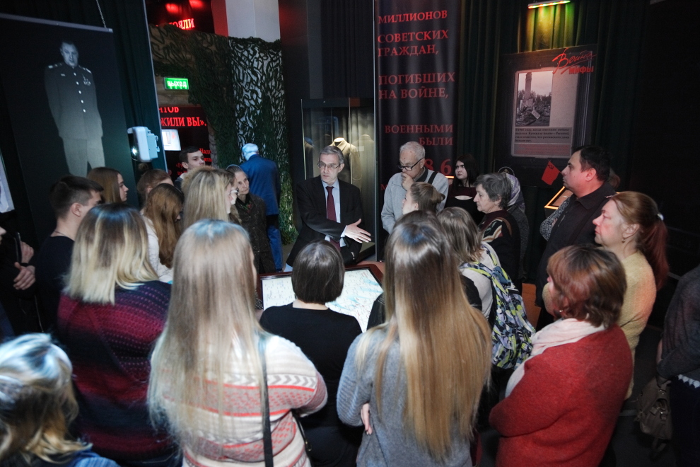 Сегодня выставка «Война и мифы» работала последний день, она была продлена по многочисленным просьбам, а ее посетители могли принести портреты своих родственников - участников Великой Отечественной войны и передать их волонтерам у входа на экспозицию. Портреты помещали на интерактивный экран и теперь они составляют «Бессмертный полк».