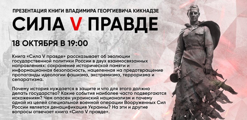 18 октября в 19:00 в Книжном клубе «Достоевский» (Москва, ул. Воздвиженка, дом 1) состоится презентация книги доктора исторических наук, члена Научного Совета Российского военно-исторического общества (РВИО) Владимира Кикнадзе «Сила V правде».
