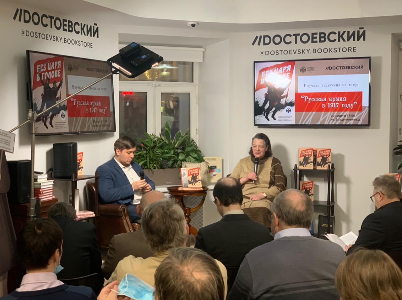 Презентация монографии кандидата исторических наук Светланы Солнцевой «Без царя в голове. Социальная модернизация Русской армии в период войны и революции (февраль – ноябрь 1917 года)» прошла в книжном клубе «Достоевский». Книга издана Российским военно-историческим обществом.