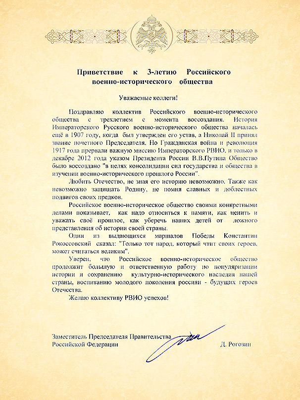 - Поздравляю коллектив Российского военно-исторического общества с трехлетием с момента воссоздания. История Императорского Русского военно-исторического общества началась ещё в 1907 году, когда был утвержден его устав, а Николай II принял звание почетного Председателя. Но Гражданская война и революция 1917 года прервали важную миссию Императорского РВИО, и только в декабре 2012 года указом Президента России В.В. Путина Общество было воссоздано "в целях консолидации сил государства и общества в изучении военно-исторического прошлого России". Любить Отечество, не зная его историю невозможно. Также как невозможно защищать Родину, не помня славных и доблестных подвигов своих предков.