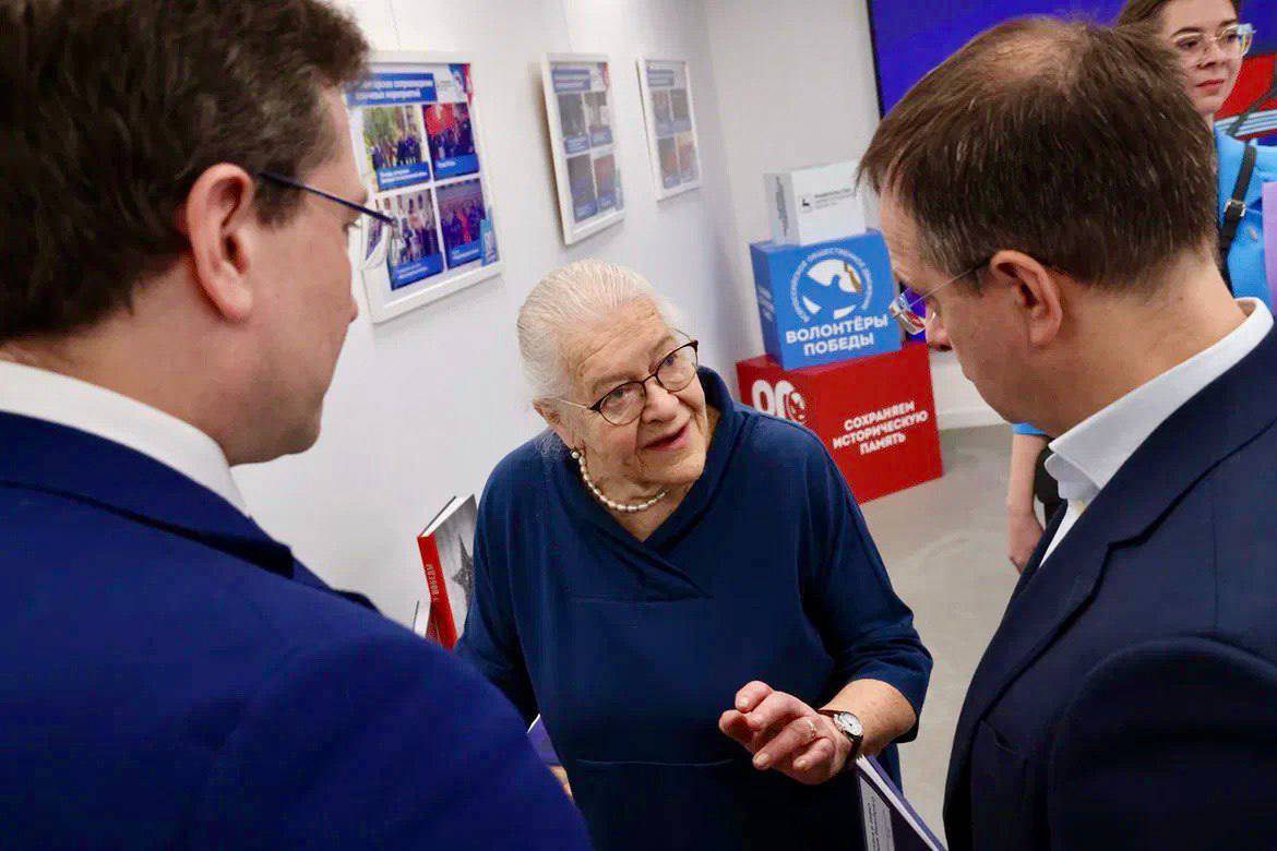 Глава региона познакомил Владимира Мединского с профессором кафедры ЮНЕСКО ННГАСУ, почетным гражданином Нижнего Новгорода Татьяной Виноградовой, которая подарила главе Союза писателей России свои книги.