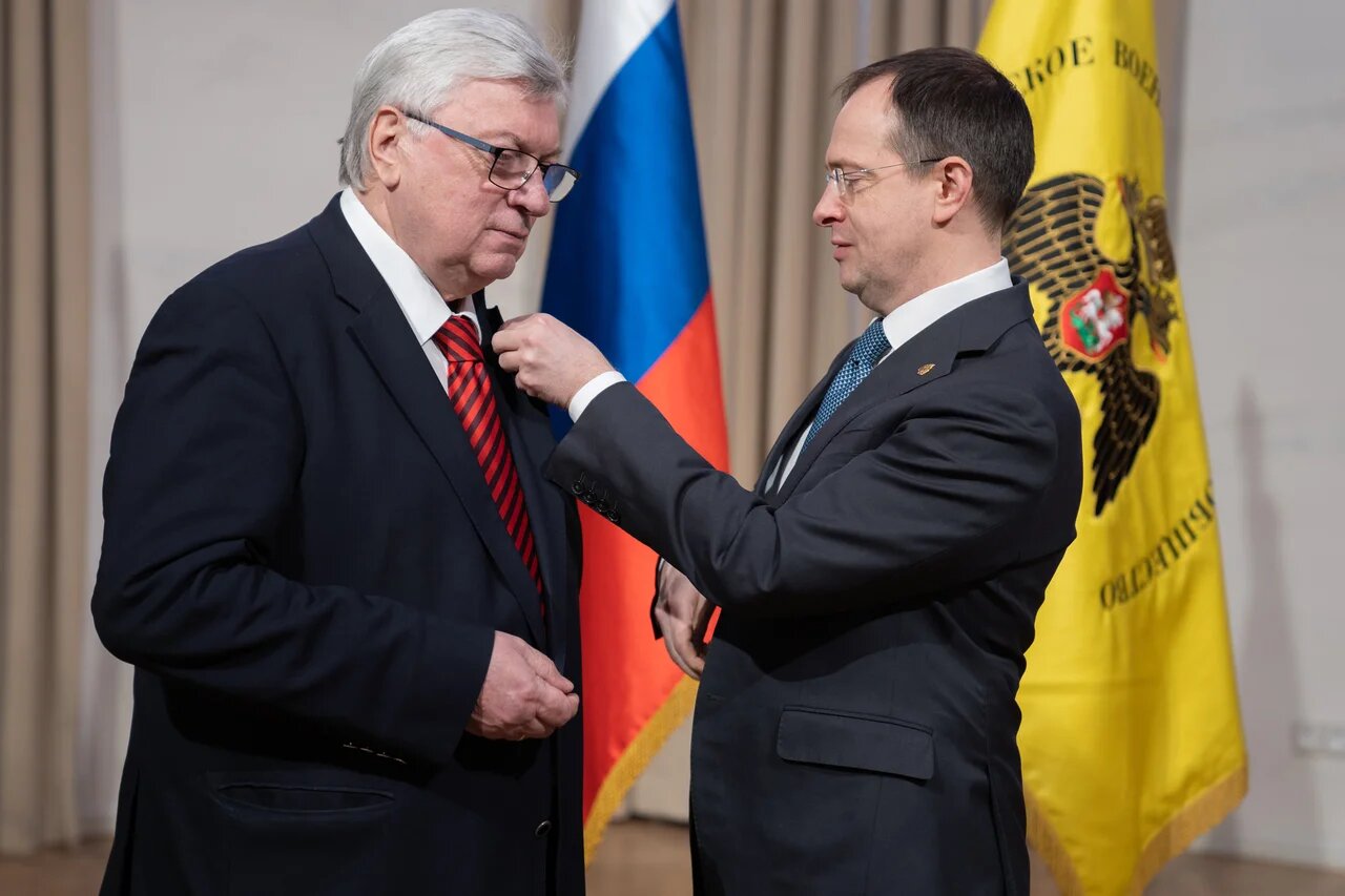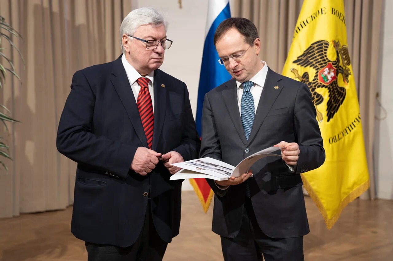 Помощник Президента РФ, Председатель Российского военно-исторического общества Владимир Мединский вручил билет и знак почетного члена РВИО ректору Московского государственного института международных отношений Министерства иностранных дел РФ Анатолию Торкунову.