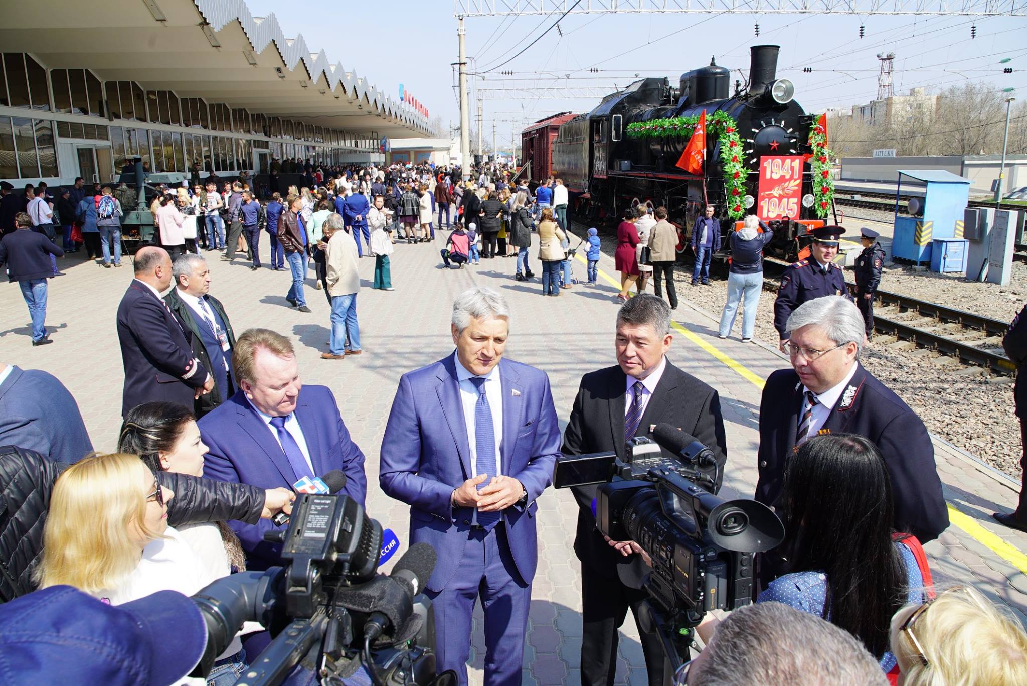 В торжественной встрече ретро-поезда «Воинский эшелон» на станции Астрахань-1 приняли участие: начальник Приволжской железной дороги – филиала ОАО «РЖД» Сергей Альмеев, депутат Государственной Думы РФ от Астраханской области Леонид Огуль и руководитель администрации губернатора Астраханской области Канат Шантимиров.