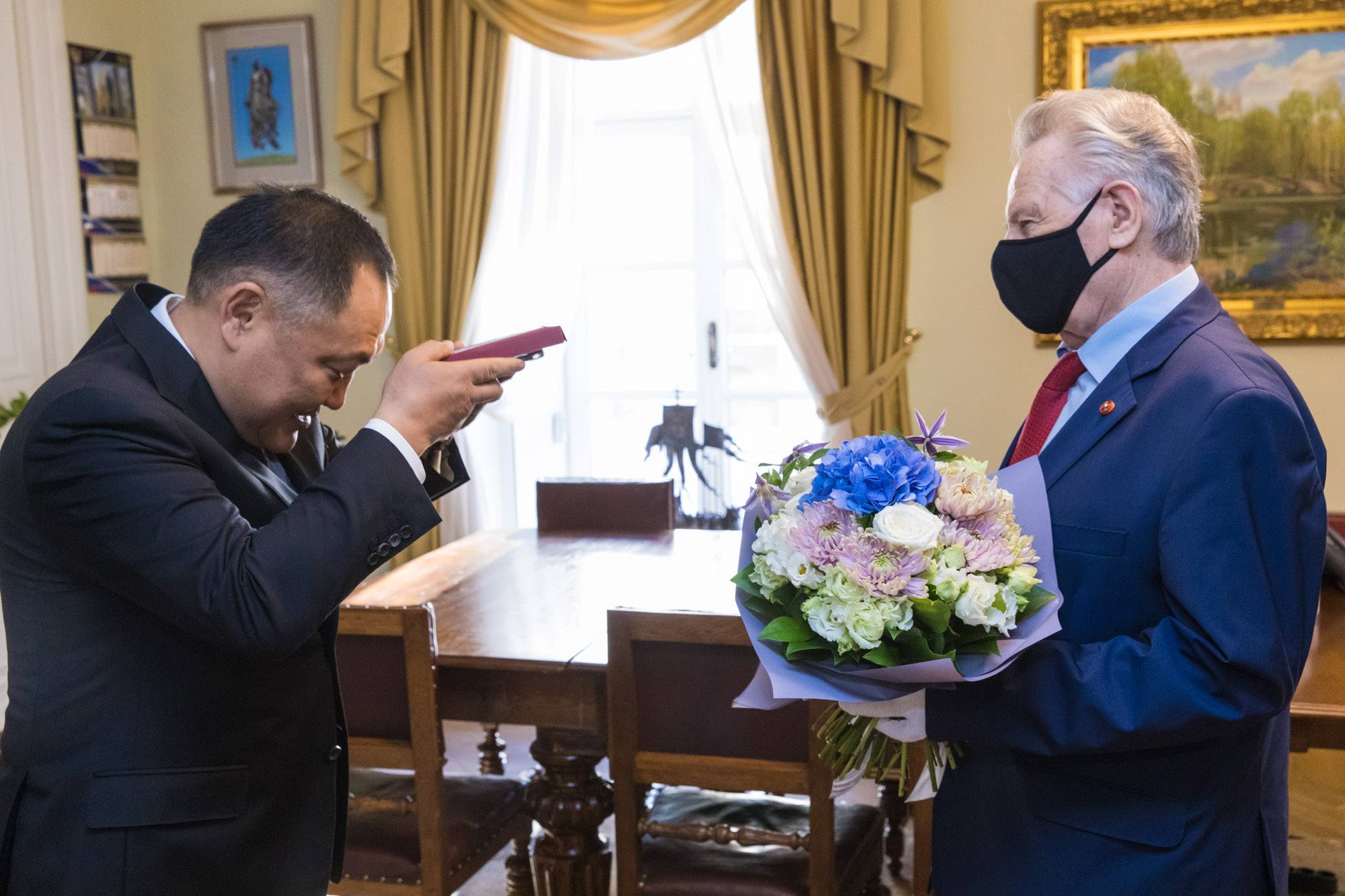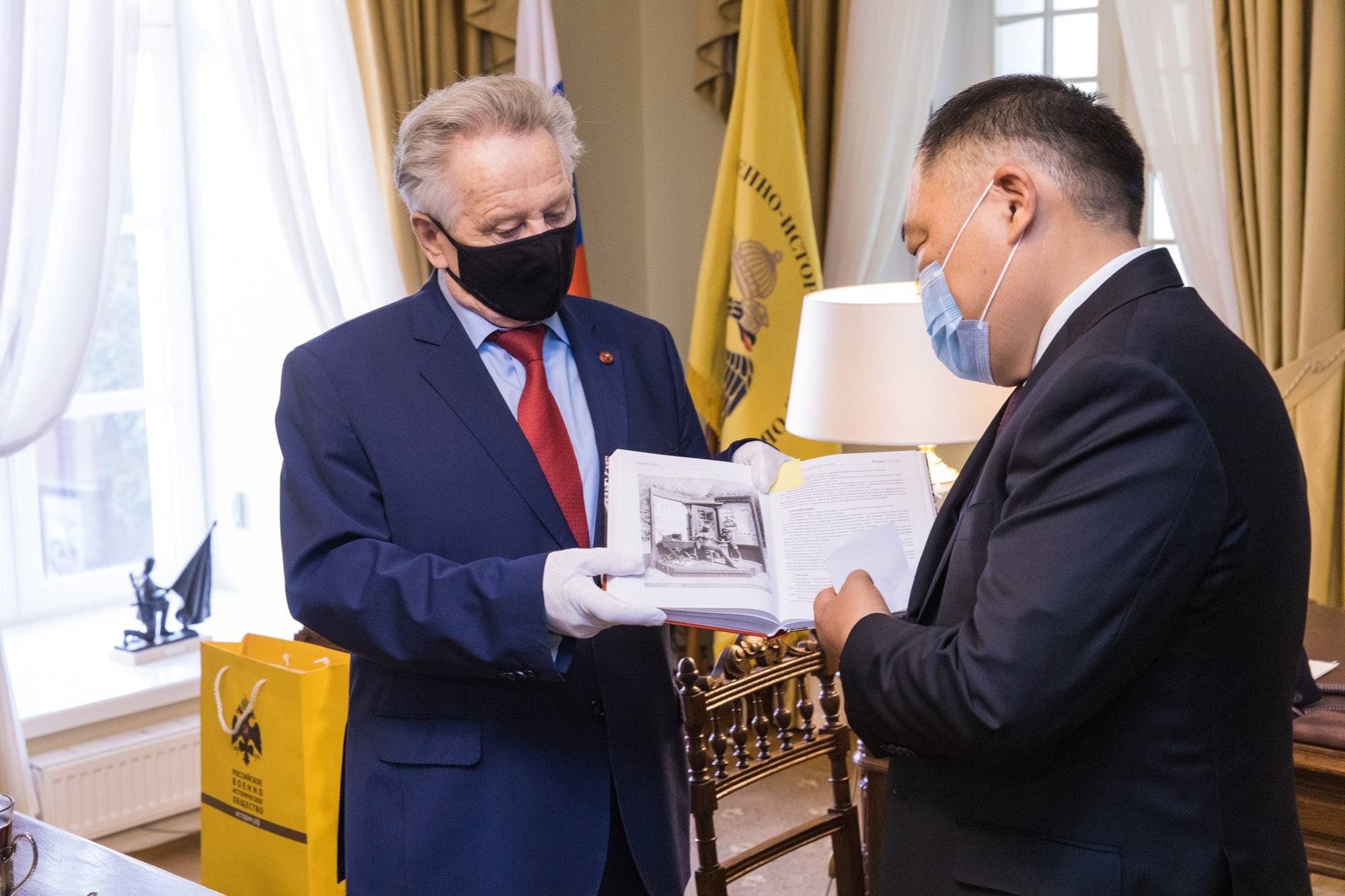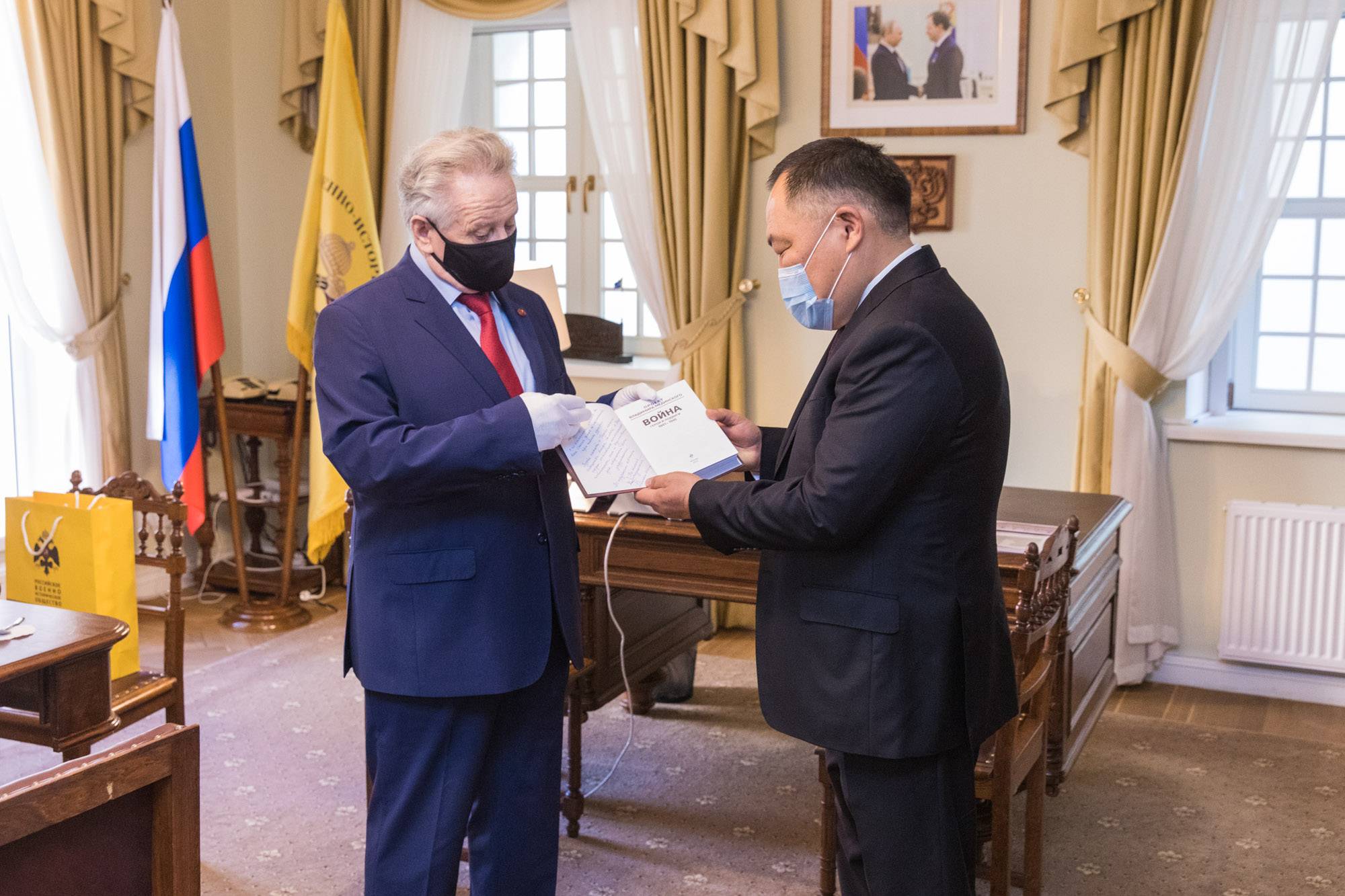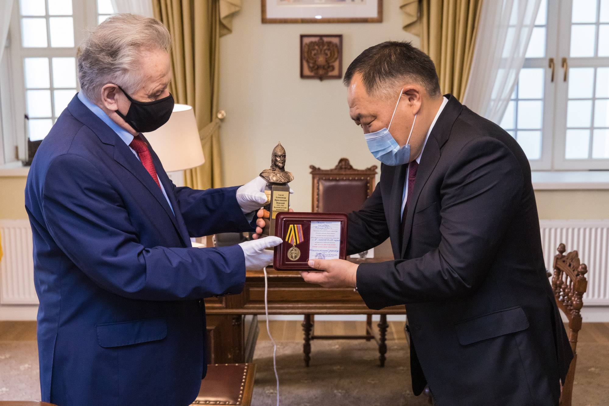 Ростислав Мединский вручил Шолбану Кара-оол памятную медаль к «800-летию со Дня Рождения Александра Невского», миниатюрный бюст святого благоверного князя Александра Невского, а также книги, вышедшие под эгидой РВИО: «Дорогами Побед» и «Война. Герои и подвиги» (автор этой книги - помощник Президента России, Председатель Российского военно-исторического общества Владимир Мединский).