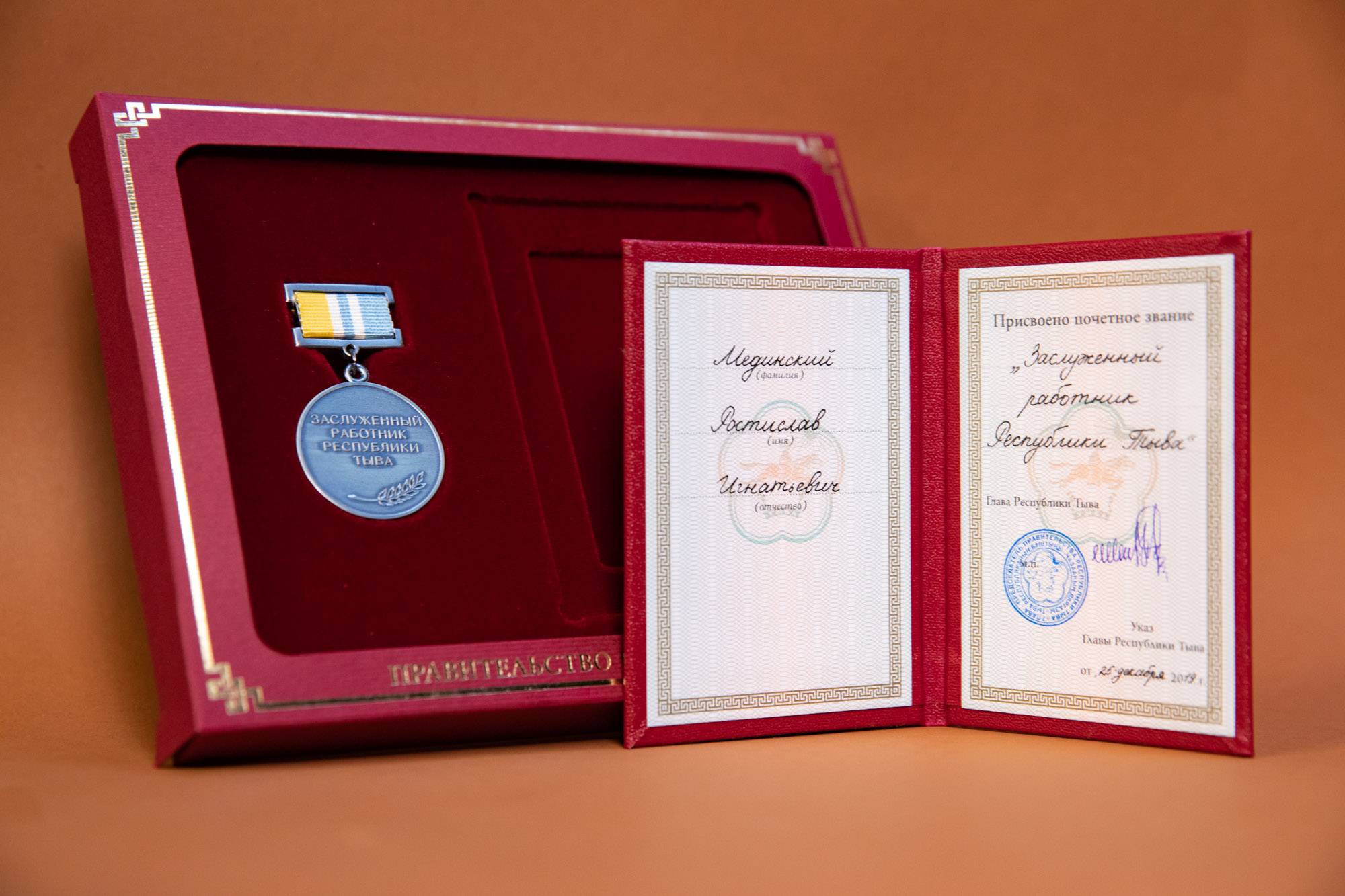 Со словами благодарности за личный вклад в сохранение исторического наследия Тувы Шолбан Кара-оол вручил Ростиславу Мединскому Государственную награду «Заслуженный работник Республики Тыва».