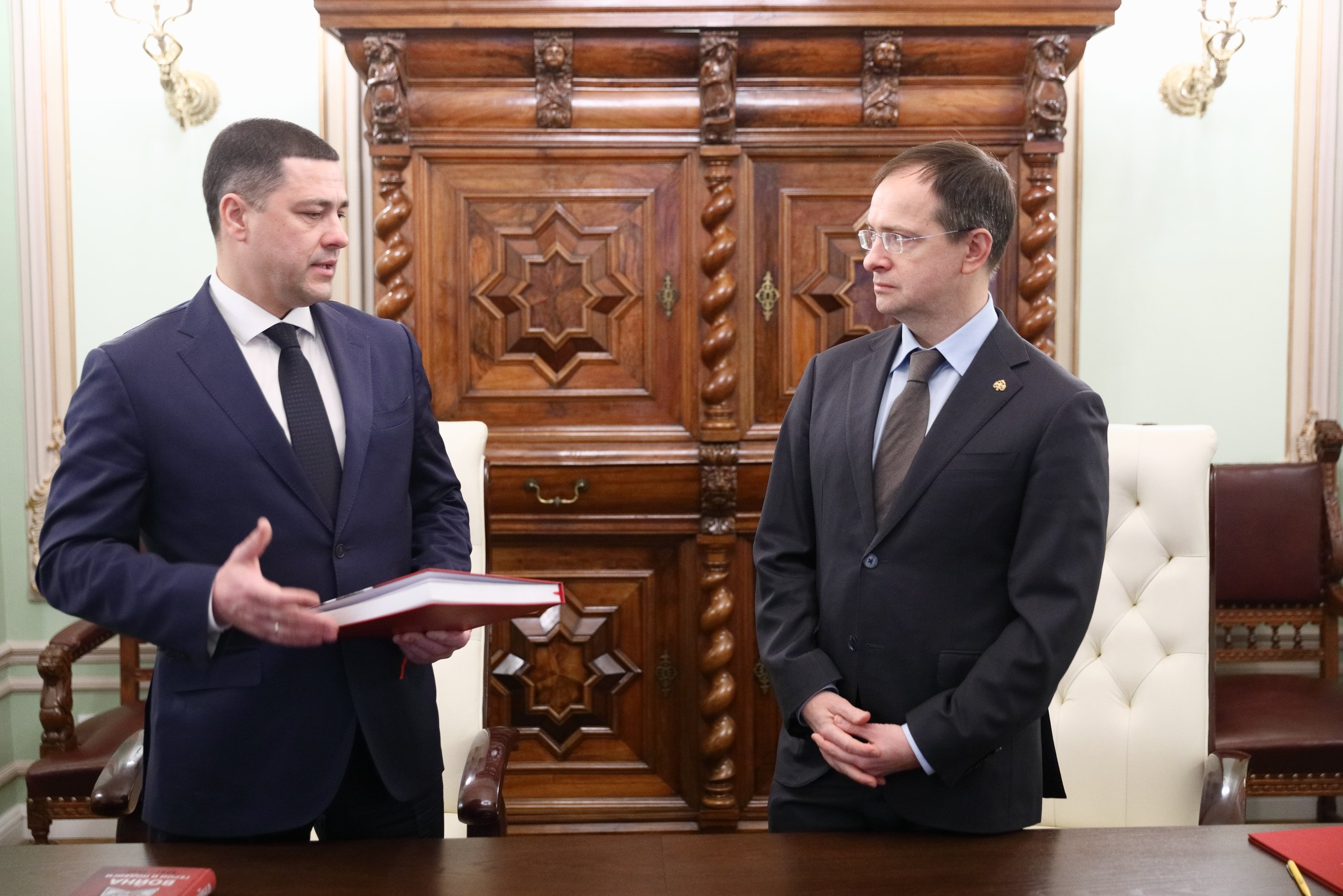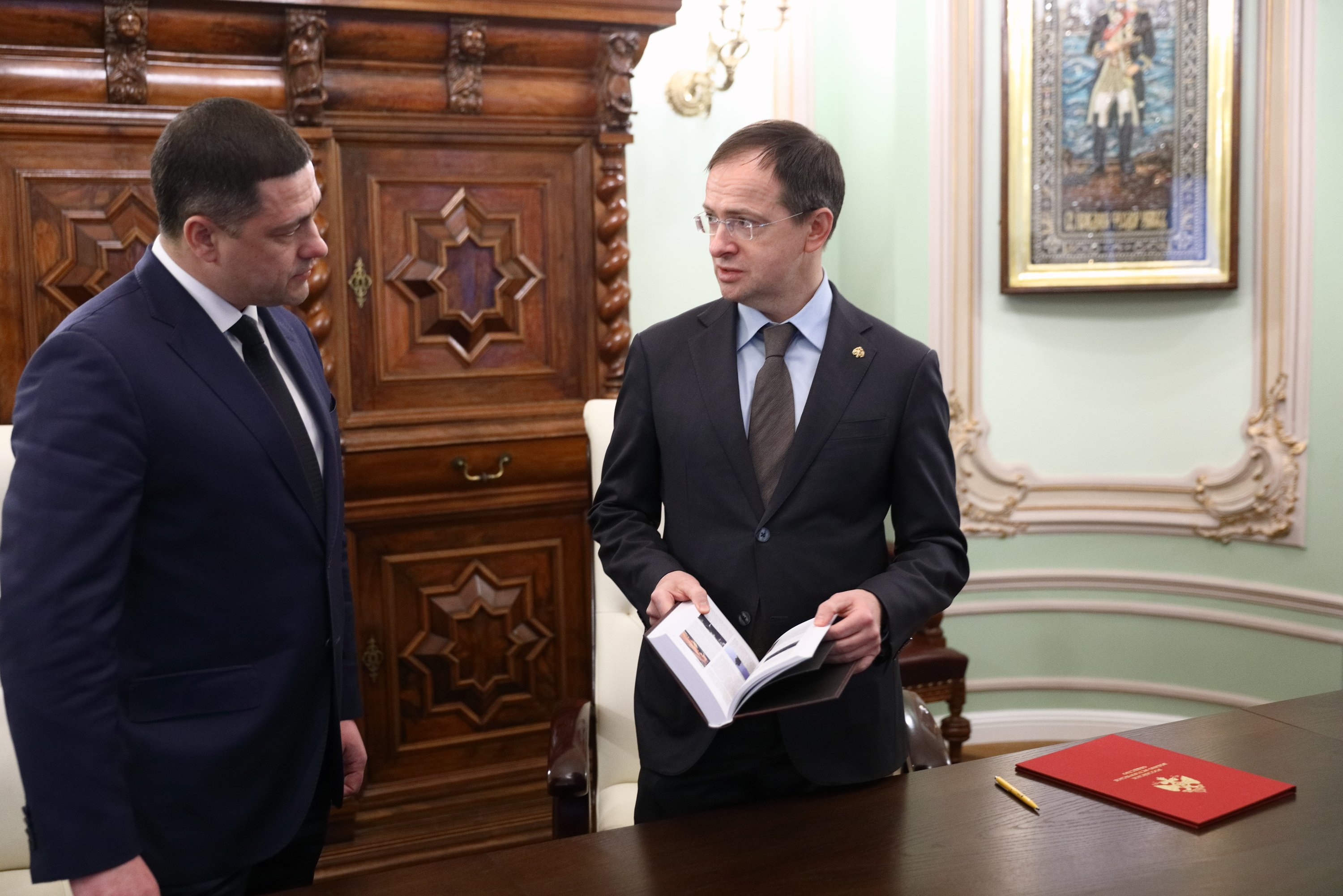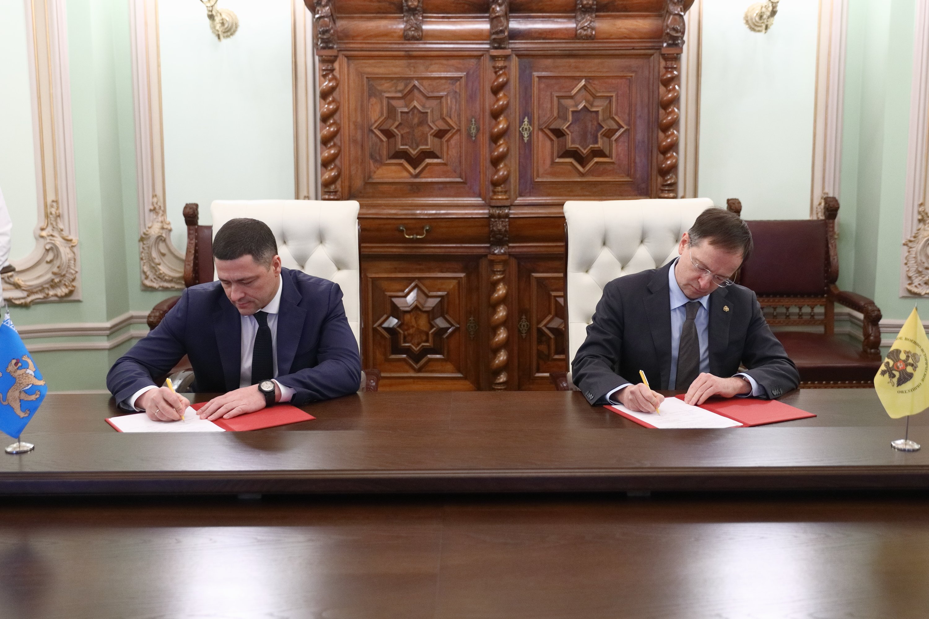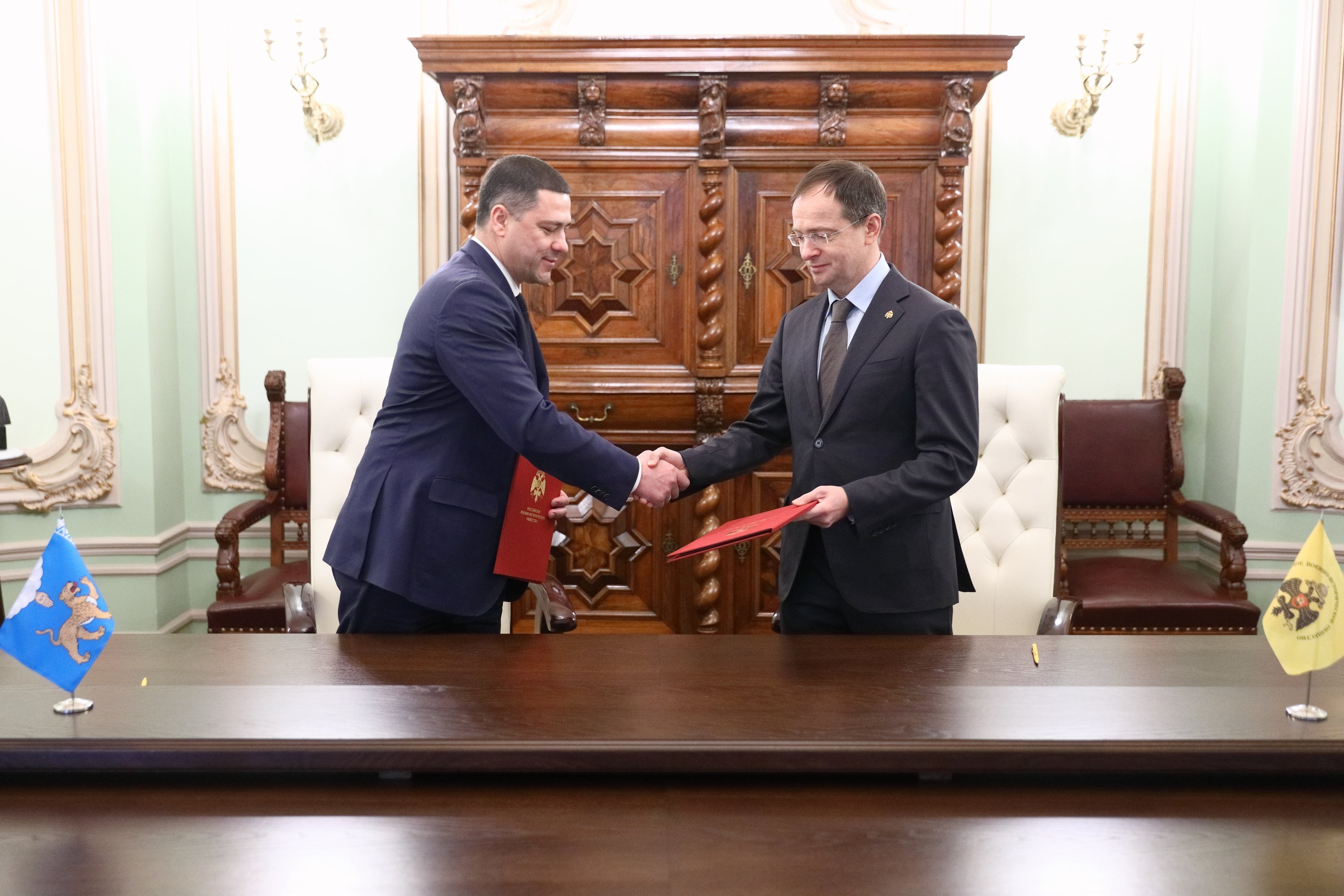 Помощник Президента РФ, Председатель Российского военно-исторического общества Владимир Мединский и губернатор Псковской области Михаил Ведерников подписали в четверг соглашение о сотрудничестве между РВИО и администрацией Псковской области. Церемония прошла в четверг, 10 декабря, в штаб-квартире РВИО в Москве.