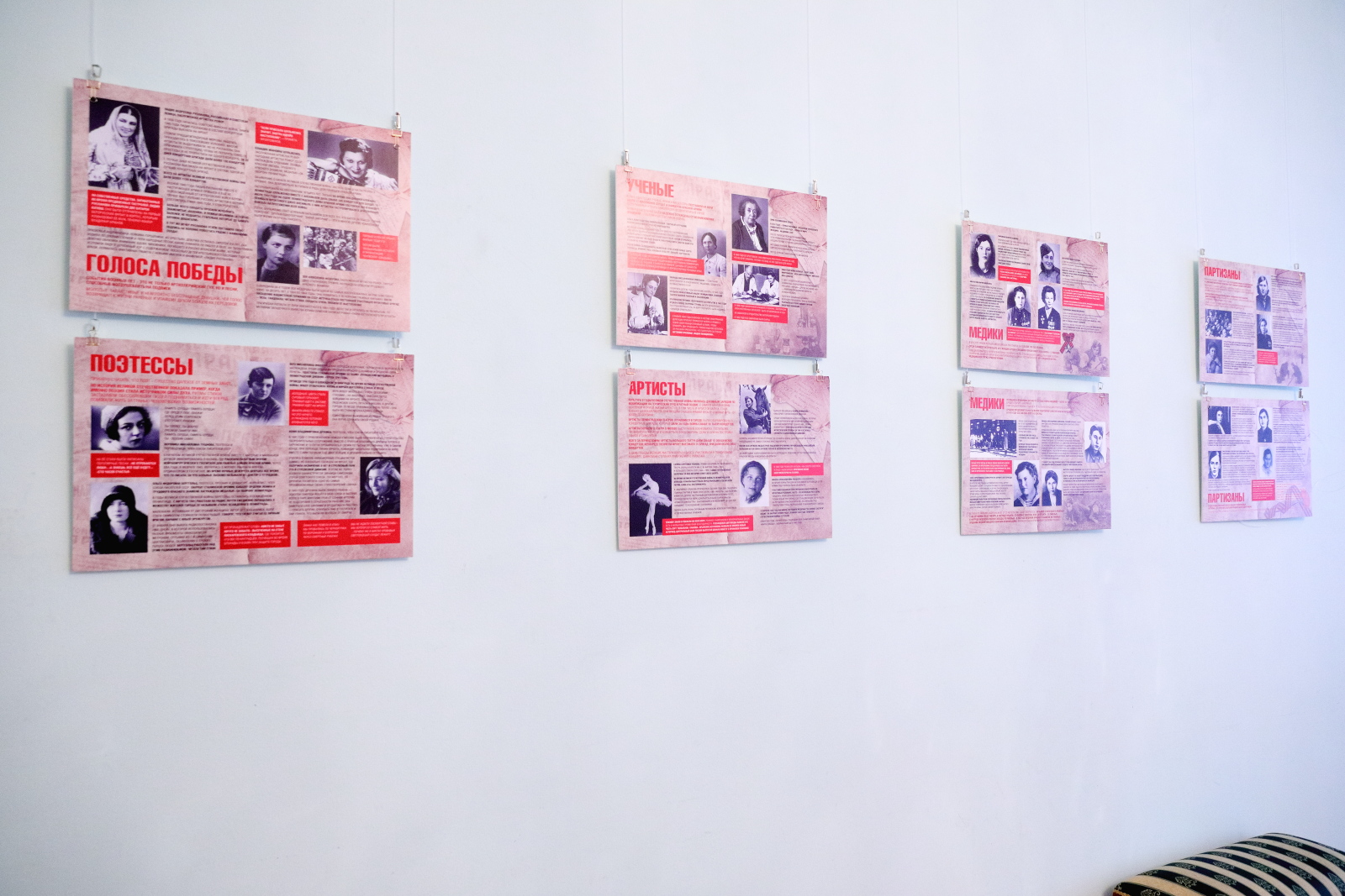 Стенды выставки представляют информацию о жизни и подвигах легендарной летчицы Валентины Гризодубовой, Зое Космодемьянской и Зине Портновой, многих других девушках и женщинах, которые воевали в танковых войсках, были связистами, снайперами, санитарками, саперами. Всего рассказано о более чем 20 воинских специальностей.