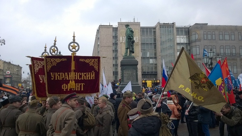 В Москве на акцию «Народный сход за братский народ» в поддержку соотечественников на Украине пришли 27 тысяч человек. Манифестанты прошли по бульварам от Пушкинской площади до проспекта Сахарова. Представители Российского военно-исторического общества (РВИО) шли во главе колонны под историческими знаменами фронтов, освобождавших Украину от гитлеровской оккупации и в форме солдат и офицеров Великой Отечественной.