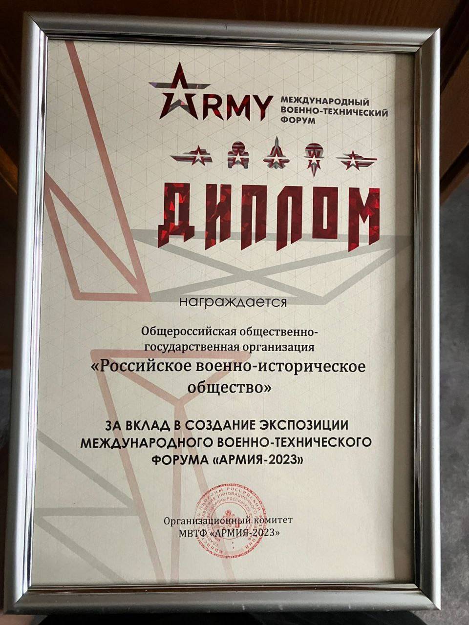 Российское военно-историческое общество удостоено Диплома «За вклад в создание экспозиции Международного форума «Армия-2023».