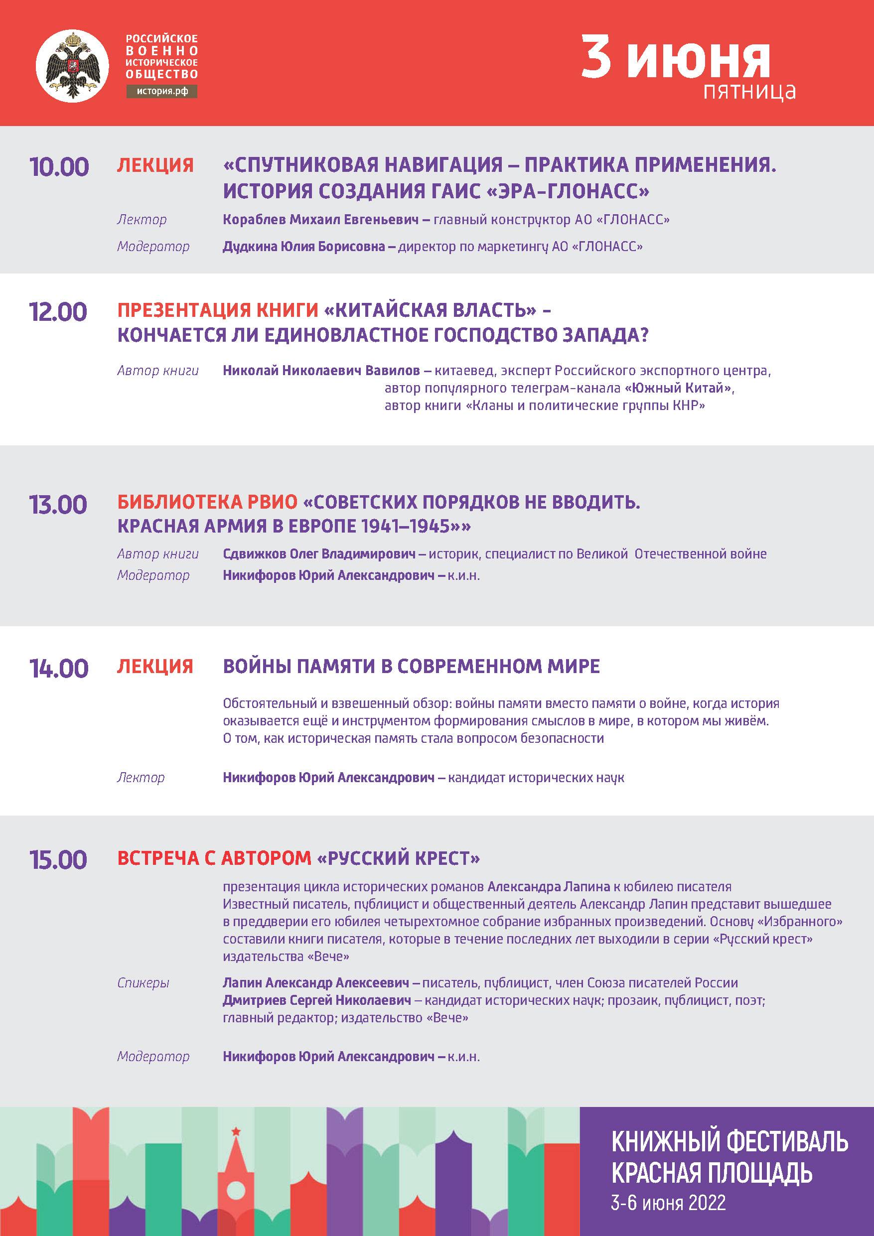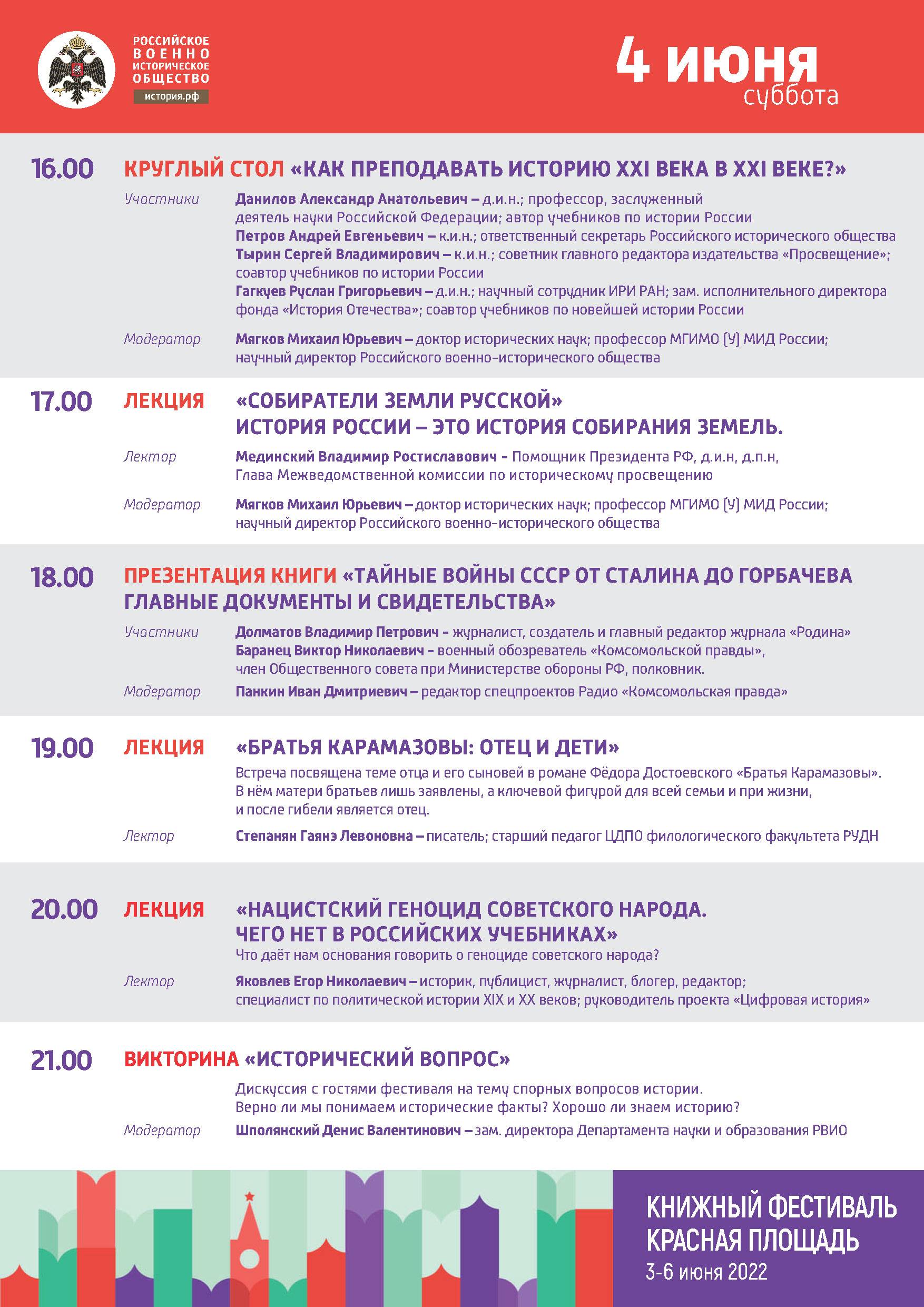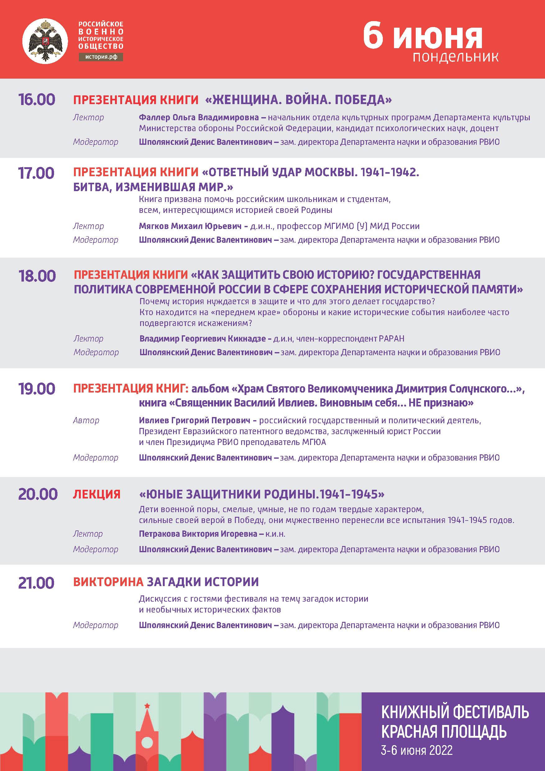 Восьмой Книжный фестиваль «Красная площадь» по традиции пройдет в самом сердце Москвы с 3 по 6 июня. В литературном празднике примет участие Российское военно-историческое общество. Стенд и мероприятия РВИО будут представлены на площадке №1 "История Отечества".