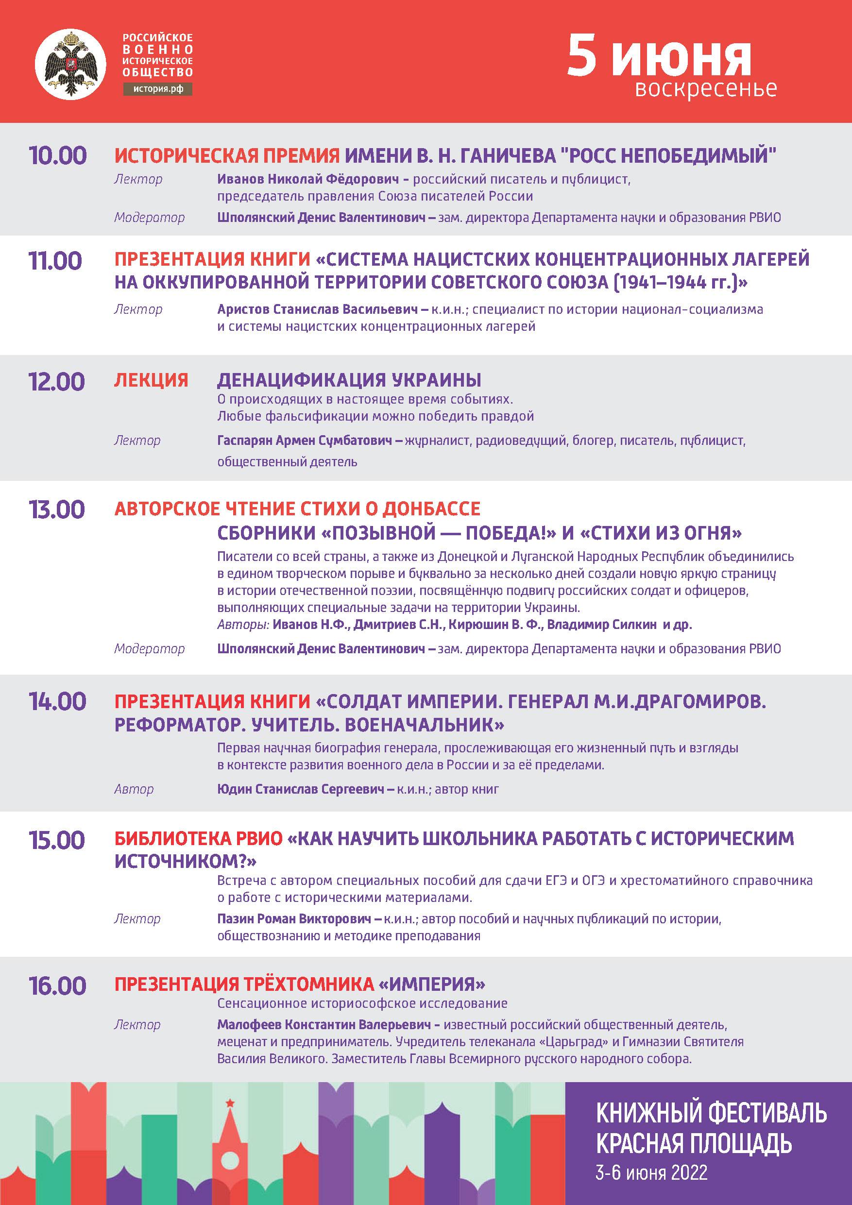 Среди самых ярких событий фестиваля лекции Председателя РВИО Владимира Мединского, Научного директора РВИО Михаила Мягкова и Члена Научного совета РВИО Юрия Никифорова.