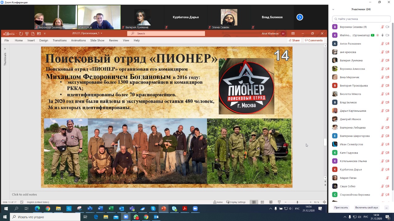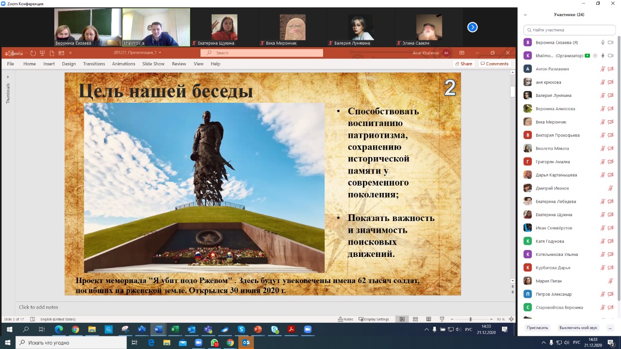 Уроки проходят в дистанционном формате, на них поисковики рассказывают ребятам о Ржевском мемориале Советскому Солдату, о поисковой работе, об участии в Международной поисковой экспедиции "Ржев. Калининский фронт", демонстрируют артефакты, обнаруженные в ходе проведения полевых поисковых работ. Их проводят руководители поисковых отрядов и объединений: Андрей Фетисов (Благотворительный фонд «Застава св. Ильи Муромца»), Сергей Щербинин (ПО «Победа») и Айрат Халимов (ПО «Пионер»).