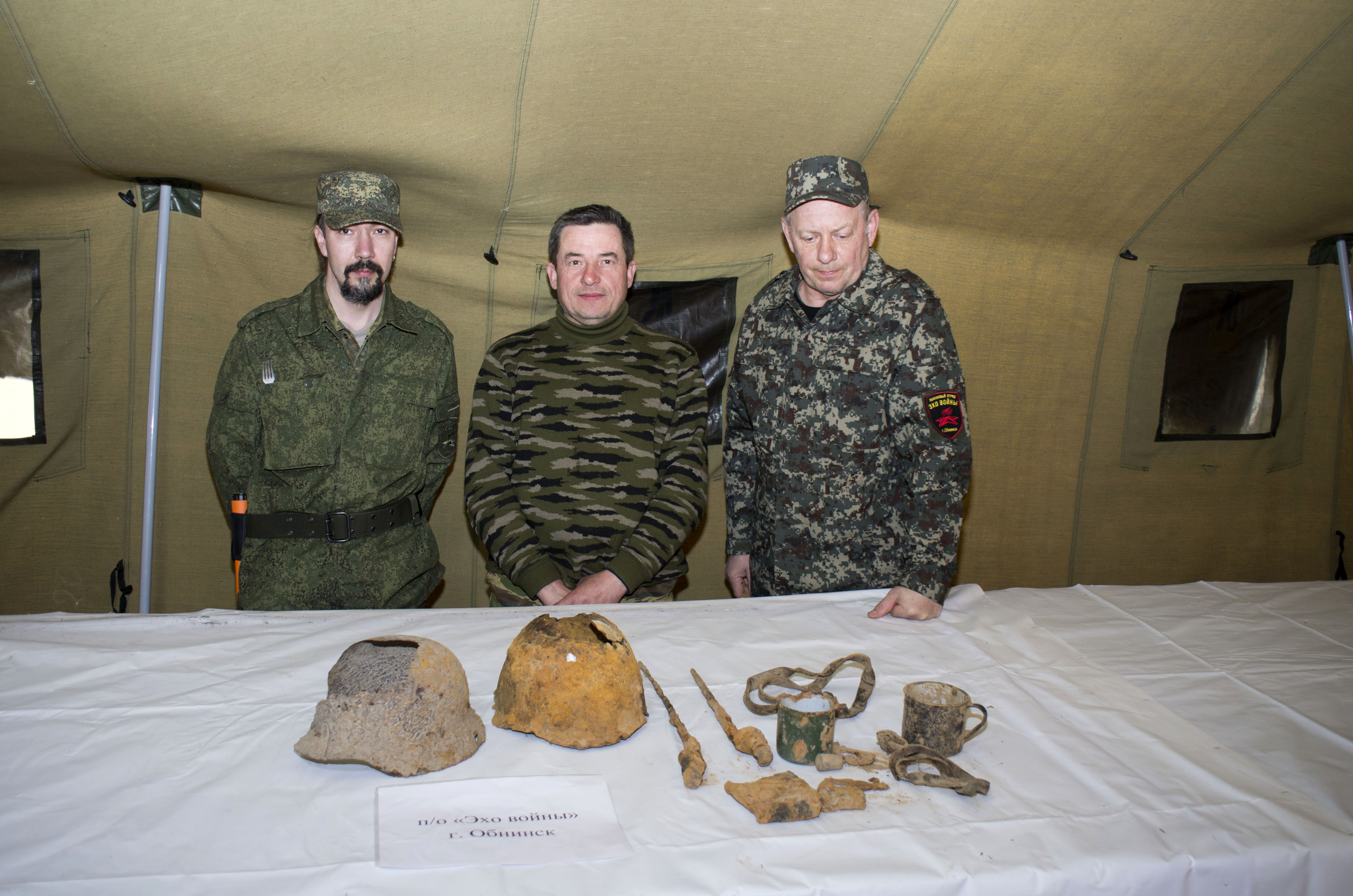 Представители первых поисковых отрядов уже прибыли в расположение лагеря прибыли. А бойцы отряда «Эхо войны» (г. Обнинск) буквально с колес успели провести разведку. Вернулись они с оперативной информацией и не с пустыми руками. В полевой музей «Калининского фронта» поступили первые экспонаты.