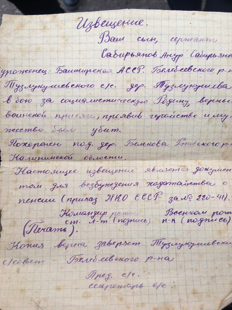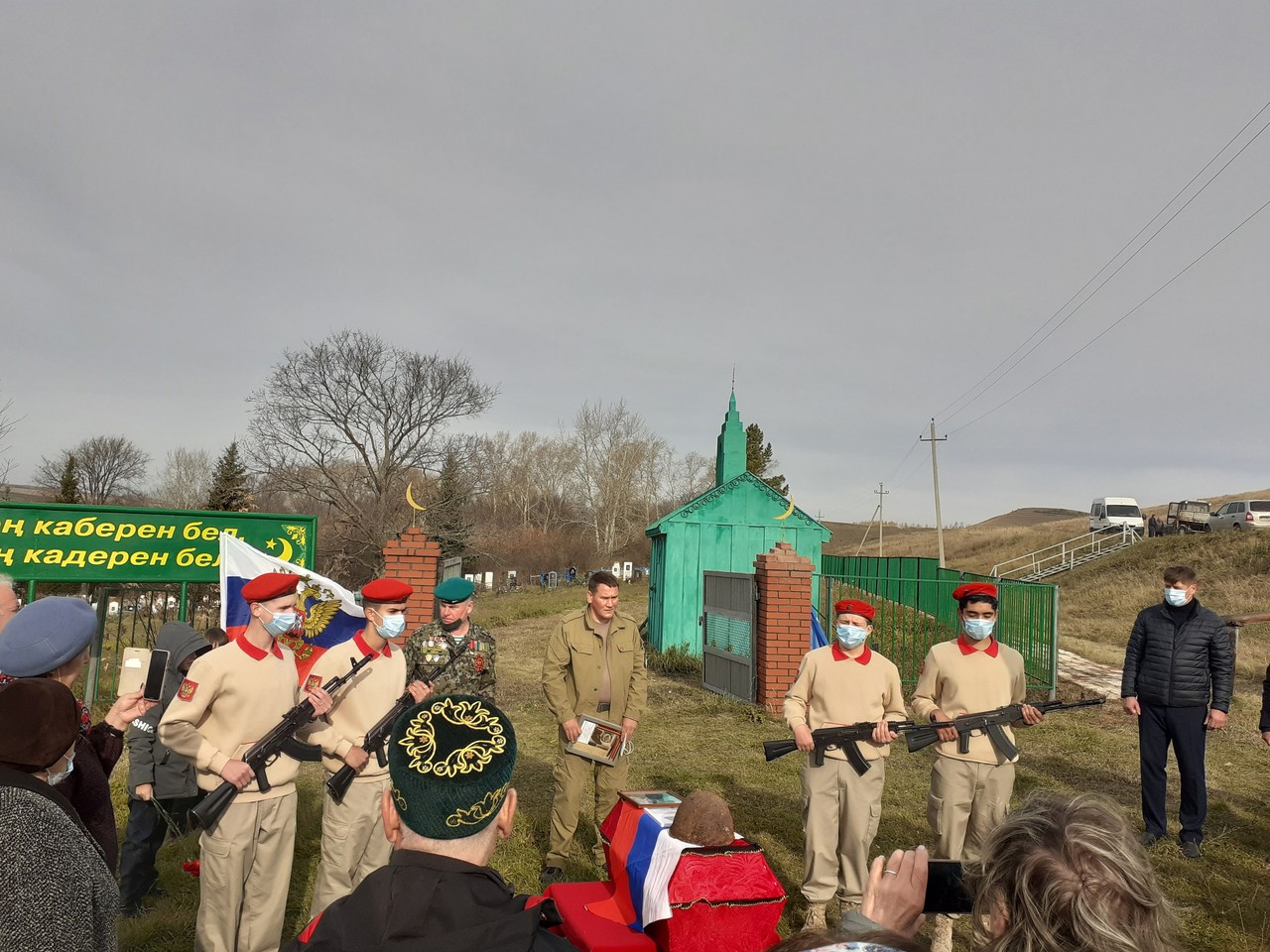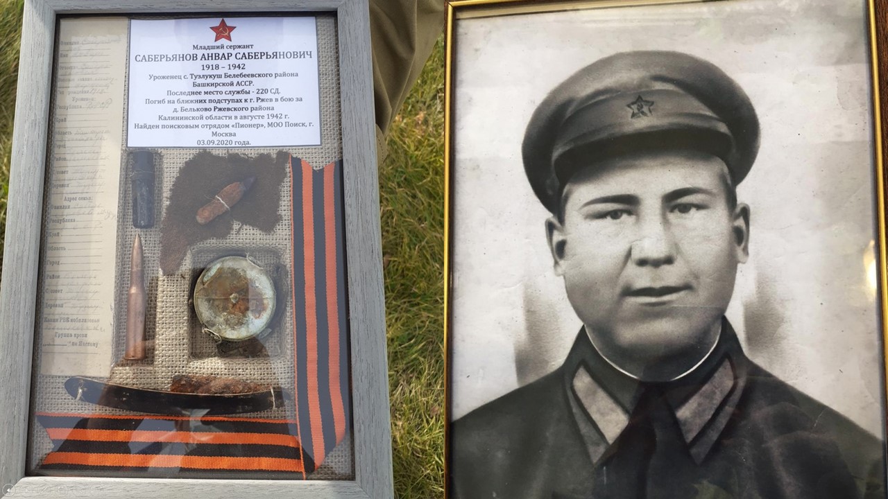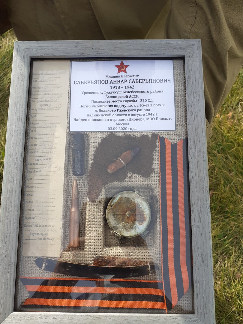 Боец был найден в августе этого года московским поисковым отрядом «Пионер» в рамках Международной поисковой экспедиции Российского военно-исторического общества «Ржев. Калининский фронт». Сержант Сабирьянов Анвар Сабирьянович погиб в августе 1942 года в ходе наступления у деревни Бельково. Проститься с ним пришли родственники, а также жители деревни Тузлукуш.