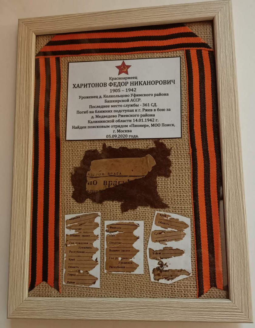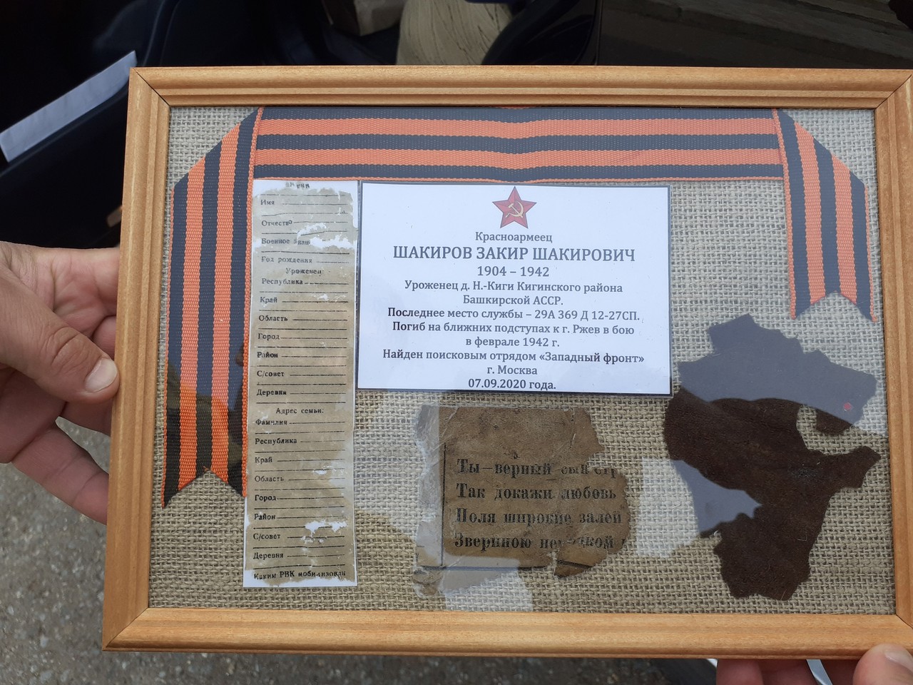 В эту поездку поисковики отряда «Пионер» передали планшеты с медальонами и личными вещами семьям еще двух погибших уроженцев Башкортостана, найденных также в ходе экспедиции у деревни Бельково: Харитонова Федора Никаноровича и Шакирова Закира Шакировича.