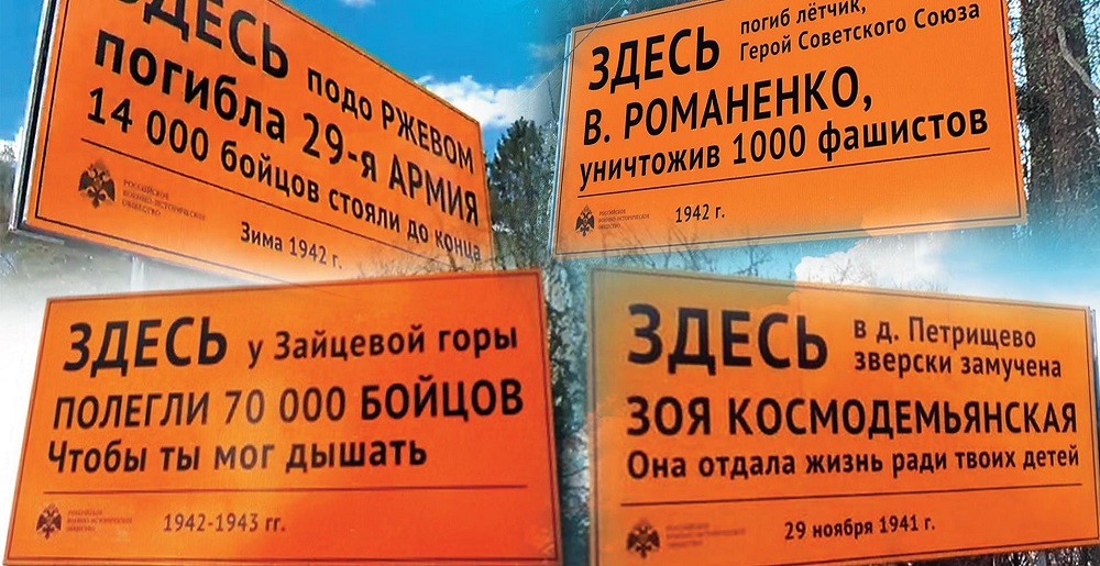 Новым способом сохранения памяти станет установка информационных дорожных знаков, с сообщениями о памятных местах и подвигах, совершенных в годы Великой Отечественной войны и не только. Российское военно-историческое общество уже ведет работу в этом направлении: первые 4 знака с сообщениями появились на автомобильных дорогах федерального и местного значения в Московской, Новгородской, Калужской и Тверской областях.