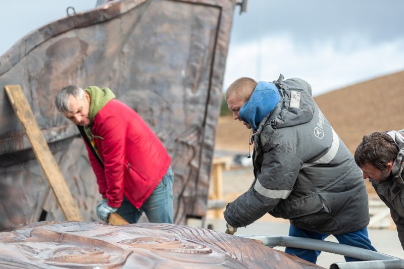 Отдельные элементы скульптурной композиции будут собраны в 5 частей, после чего с помощью спецтехники их поднимут на курган для окончательного монтажа. Параллельно на объекте продолжаются работы по благоустройству прилегающей территории, ведется обустройство пешеходных дорожек, создается сопутствующая инфраструктура.