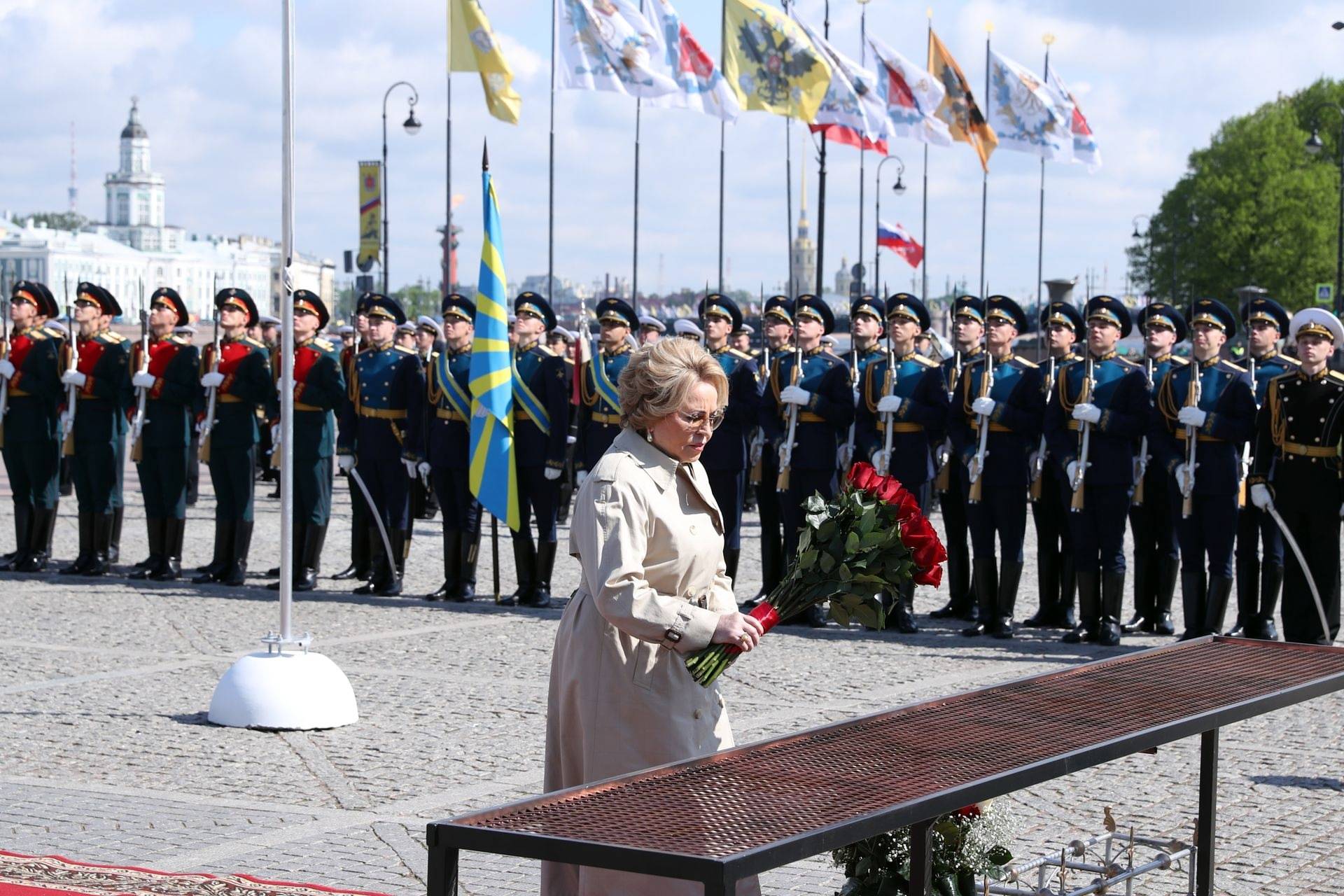 В День основания Санкт‑Петербурга на Сенатской площади состоялась торжественная церемония возложения цветов к памятнику Петру I.