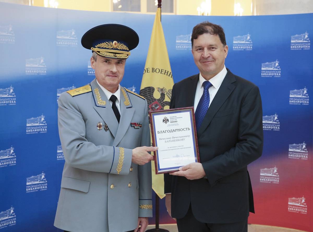 По окончании открытия выставки состоялось заседание Совета Санкт-Петербургского регионального отделения Российского военно-исторического общества. Благодарности Российского военно-исторического общества были вручены директору Департамента по просветительской работе Президентской библиотеки Игорю Солонько и директору Департамента по научно-экспертной работе Президентской библиотеки Алексею Вороновичу. От Санкт-Петербургского Регионального отделения РВИО благодарность «за активное участие в военно-историческом просвещении» была вручена начальнику Первого пограничного кадетского военного корпуса ФСБ России, генерал-майору юстиции Вячеславу Бараненкову.