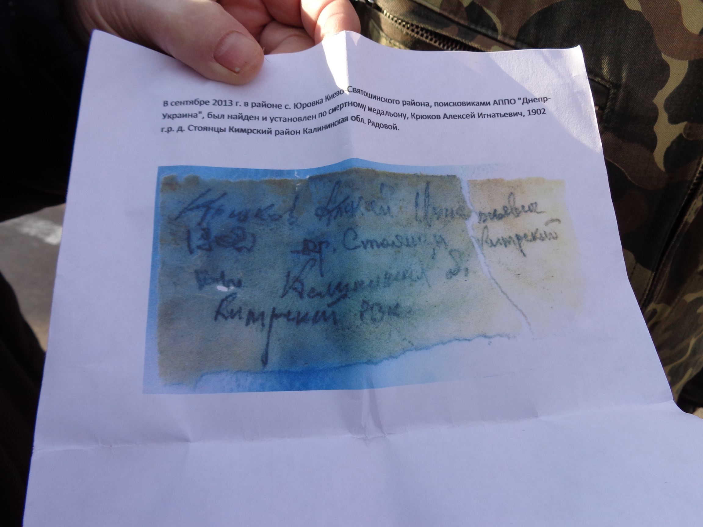 Поисковики ежегодно поднимают из земли останки нескольких тысяч воинов, погибших в годы Великой Отечественной войны. Имена большинства из них установить, к сожалению, невозможно. Лишь чудом уцелевшие личные документы или так называемые смертные медальоны позволяют идентифицировать останки героев. Именно записка смертного медальона позволила определить имя красноармейца – Алексея Игнатьевича Крюкова, обнаруженного украинскими поисковиками в прошлом году неподалеку от Киева. 21 февраля 2014 года на Троекуровском кладбище Москвы состоялось перезахоронение защитника Отечества, сражавшегося с фашистами за столицу Украины.