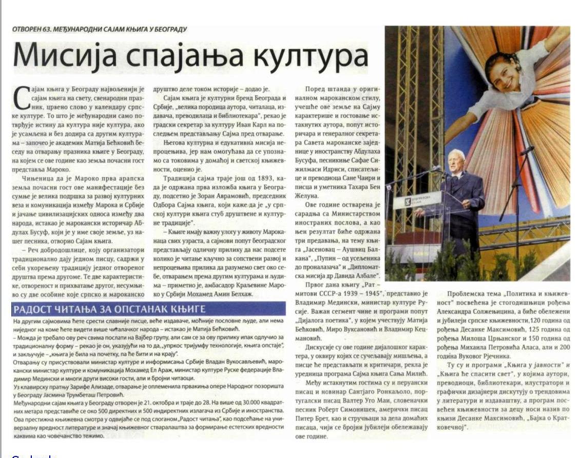 По итогам Белградской книжной ярмарки было проведено исследование сербской прессы, посвященное участию российских авторов в книжном форуме. Книга Владимира Мединского стала одним из самых часто упоминаемых изданий, представленных на ярмарке не только в категории русскоязычных авторов, но и зарубежных. Всего по итогам презентации книги было опубликовано около 20 текстовых материалов, а также несколько видеосюжетов.