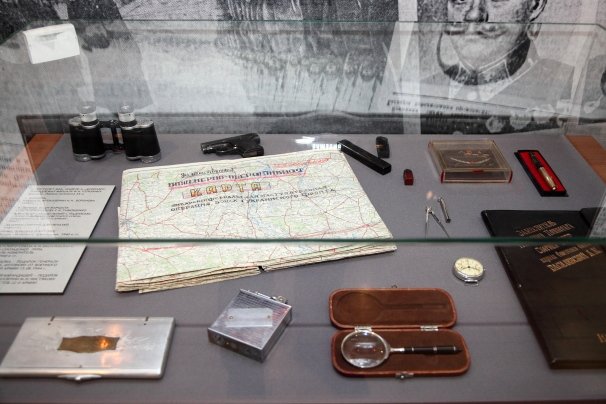 Он добавил, что на выставке много простреленных документов. В том числе простреленный партийный билет командира мотострелковой дивизии лейтенанта Бумагина, который 70 лет назад 24 апреля бросился на амбразуру, закрыв своим телом вражеский пулемет, чем обеспечил продвижение своего мотострелкового взвода вперед.