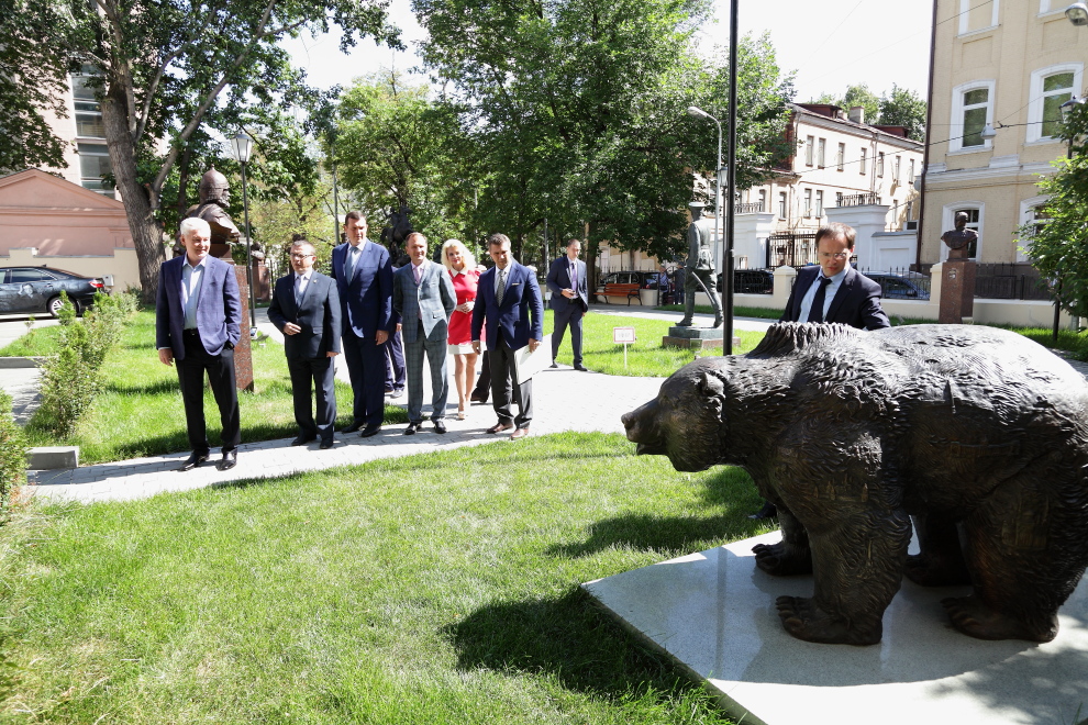 Мэр осмотрел «Сквер Победителей», благоустроенный Обществом в 2015 году. Ему рассказали, как заброшенный сквер РВИО превратило в прекрасное место отдыха для горожан и гостей столицы. Теперь здесь разместилась экспозиция, посвящённая героям военной истории Отечества и регулярно демонстрируется кино на военно-историческую тематику.