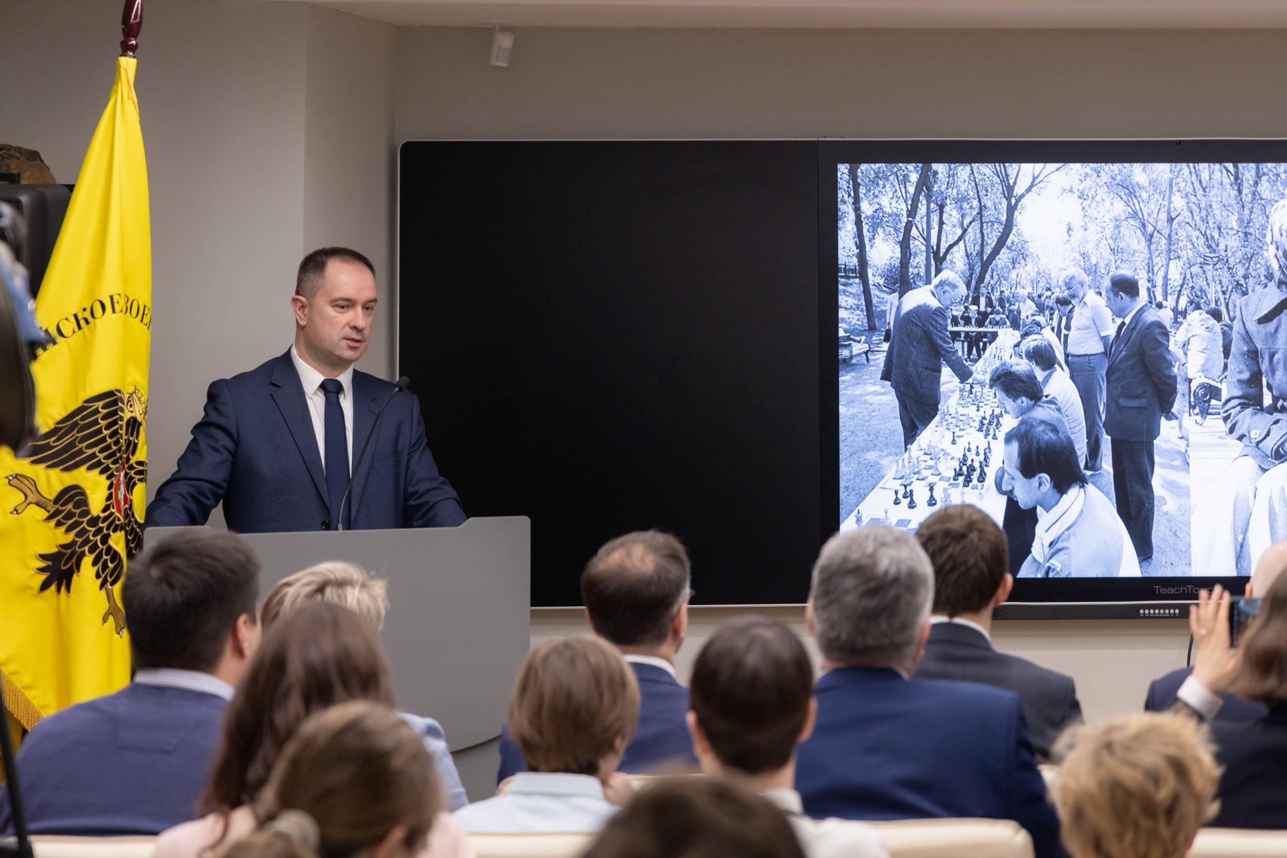 Заведующий центром экспертизы учебно-методических материалов и цифрового контента Филипп Шакиров поблагодарил Российское военно-историческое общество за открытие «Шахматной школы» в Музее военной формы и отметил важность проекта для подрастающего поколения.