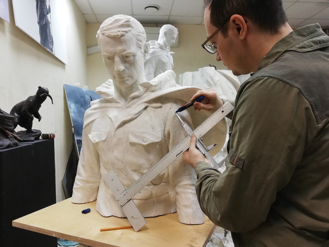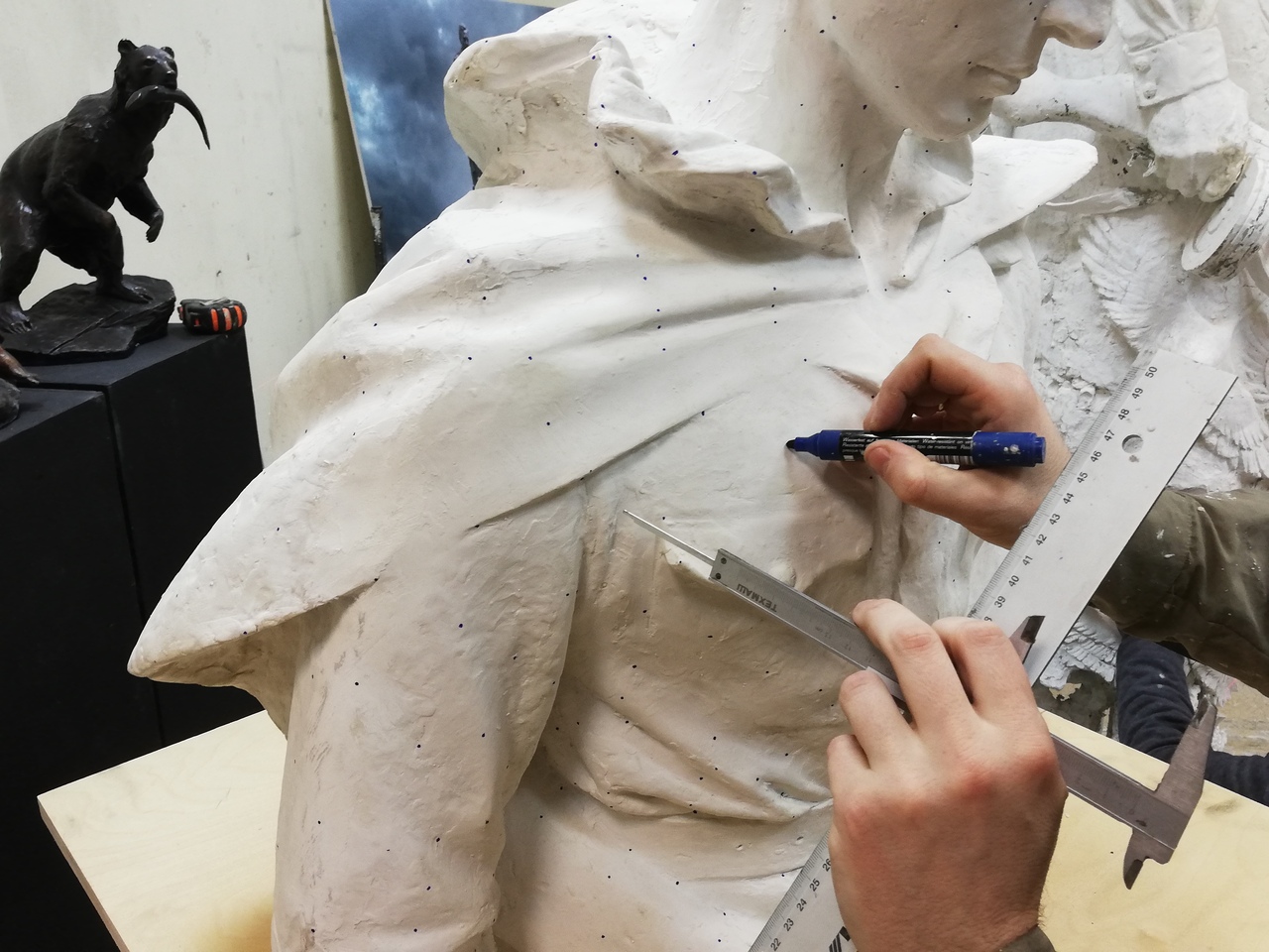 Далее скульпторам предстоит кропотливая работа по измерению расстояния от каждой точки, нанесенной на поверхность модели, до отметок на раме. Результаты измерений записываются в специальный журнал. После завершения данного этапа работ настанет черед увеличения фигуры – будет создана кубическая рама, увеличенная в 10 раз. Пропорционально увеличивая результаты измерений, авторы отметят в пространстве нужные точки, создав металлический каркас из арматуры, который станет «скелетом» глиняной фигуры.