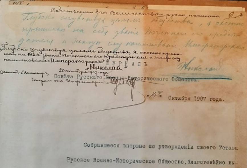 Таким образом 20 октября (2 ноября) 1907 г. государь ознакомился с журналом Совета военно-исторического общества с ходатайством о принятии должности Почётного Председателя общества. Без долгих раздумий Николай Александрович написал на нём: «Глубоко сочувствуя целям общества, я охотно принимаю на себя звание Почётного его председателя и жалую ему наименование Императорского. Николай». В тот же день, а это была суббота, монаршее согласие было доставлено в Петербург, и журнал, подписанный императором синим карандашом и переписанным чернилами с визой военного министра А.Редигера, был доставлен Председателю Совета Дмитрию Антоновичу Скалону.