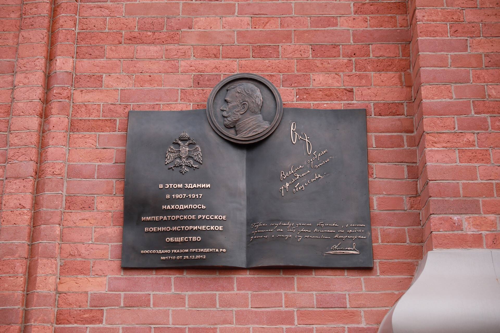 С 1907 по 1917 годы Совет, канцелярия и хранилище основного фонда Императорского Русского военно-исторического общества располагались в здании бывшего Артиллерийского исторического музея (ныне – Музея артиллерии, инженерных войск и войск связи Минобороны России). В память об этом на здании музея открыта мемориальная доска. В основу её композиции легла памятная надпись императора Николая II, а также виза которой он в 1907 году лично утвердил Устав организации.