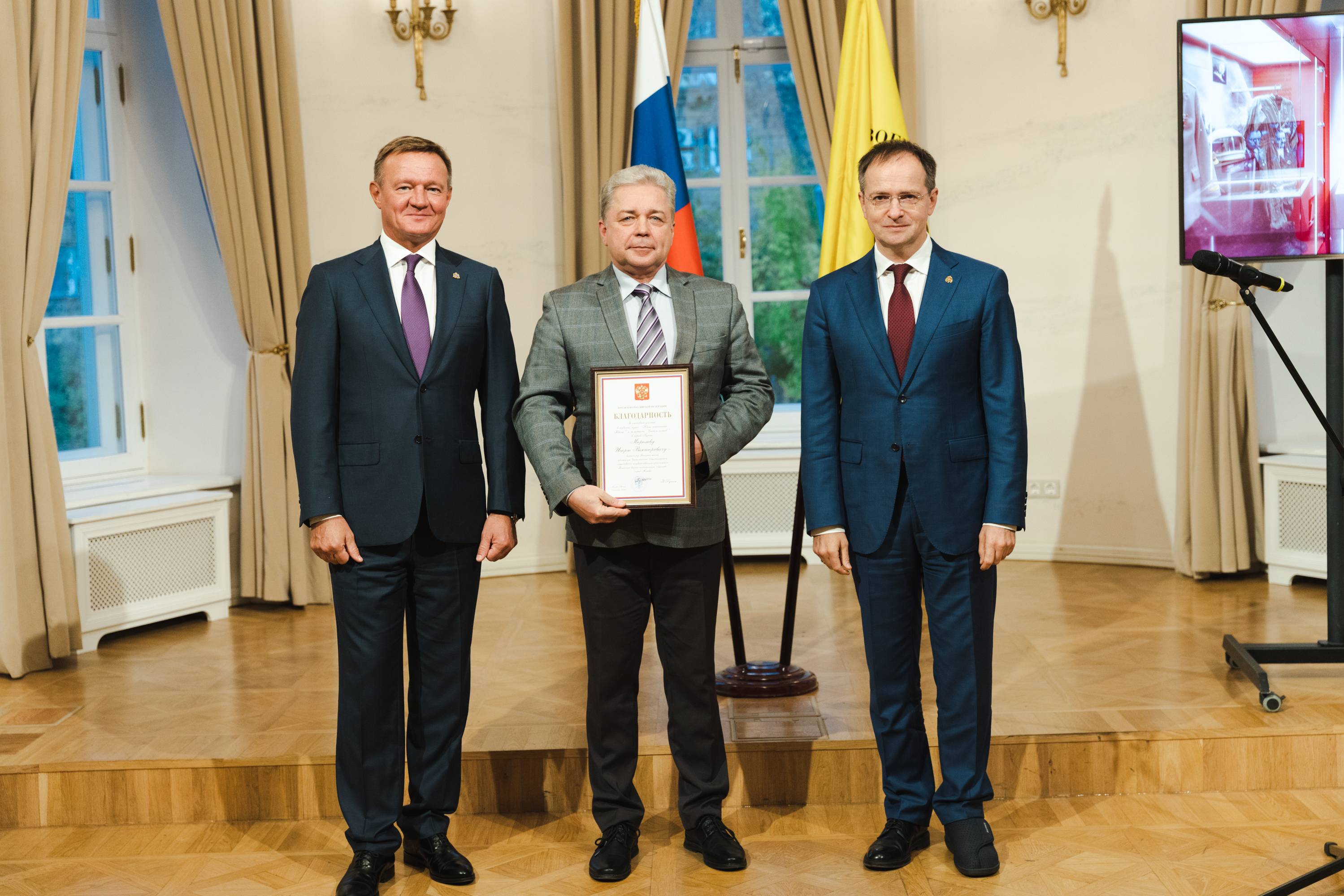 - Мы 1 июня открыли с вами замечательный музей в Курске. Огромное спасибо губернатору Курской области, который день и ночь этим вопросом занимался, и без его помощи ничего бы не состоялось. Президент принял решение поощрить тех, кто проявил инициативу, поэтому для меня большое удовольствие вручить эти благодарности, - сказал Владимир Мединский.