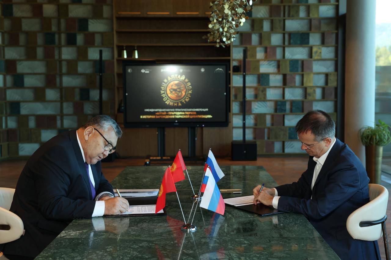 Сегодня в рамках II Международной научной конференции «Алтай – прародина тюрков. К истории зарождения тюркской цивилизации» подписан Меморандум о взаимопонимании между Межведомственной комиссией по историческому просвещению при Президенте Российской Федерации в лице ее Председателя Владимира Мединского и Секретариатом при Государственном секретаре Кыргызской Республики в лице Государственного секретаря Кыргызской Республики Марата Иманкулова.