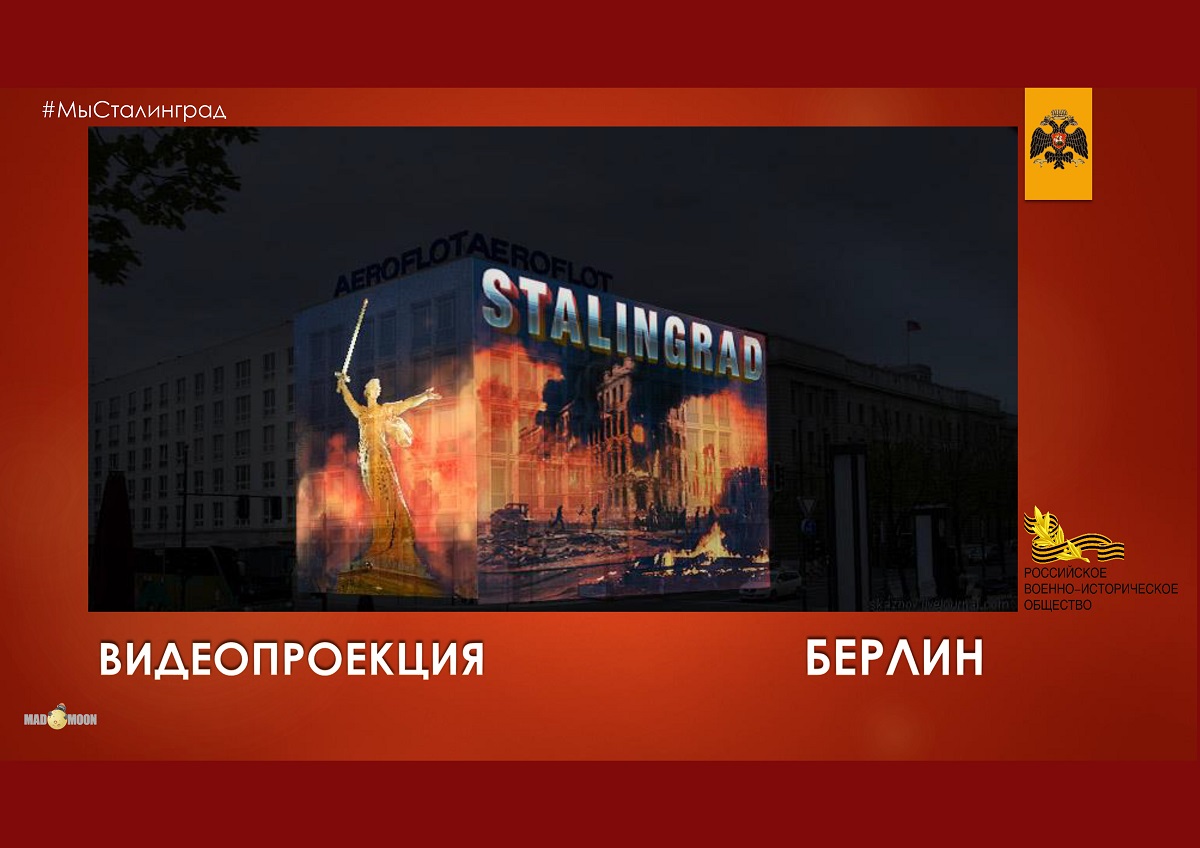 К юбилею Сталинградской Победы Российское военно-историческое общество (РВИО) предложило показать на зданиях российских посольств за рубежом световые инсталляции главных образов Великой Отечественной войны, связанных со Сталинградской битвой.