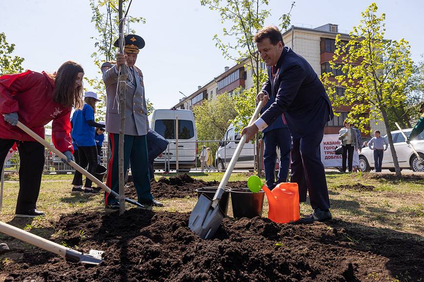 В завершение участники церемонии возложили гирлянды и цветы к стеле, после чего Рустам Минниханов и Ильсур Метшин присоединились к акции «Сад памяти». Всего было посажено 25 деревьев – 15 рябин и 10 черемух в память о погибших в годы Великой Отечественной войны. Атмосферу дополнила концертная программа с участием творческих коллективов города.