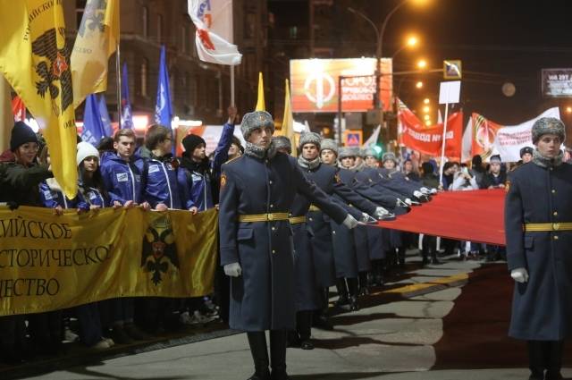 В Новосибирске в честь открытия стелы прошло шествие трудовых коллективов. Новосибирцы вышли на Красный проспект с флагами и вымпелами с символикой своих предприятий.