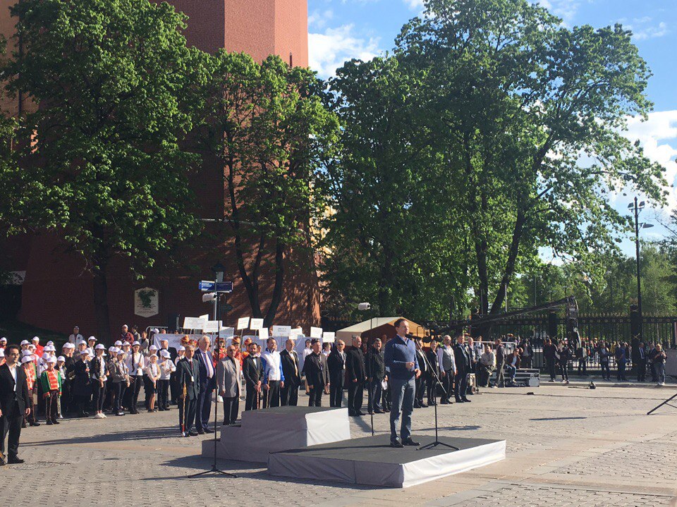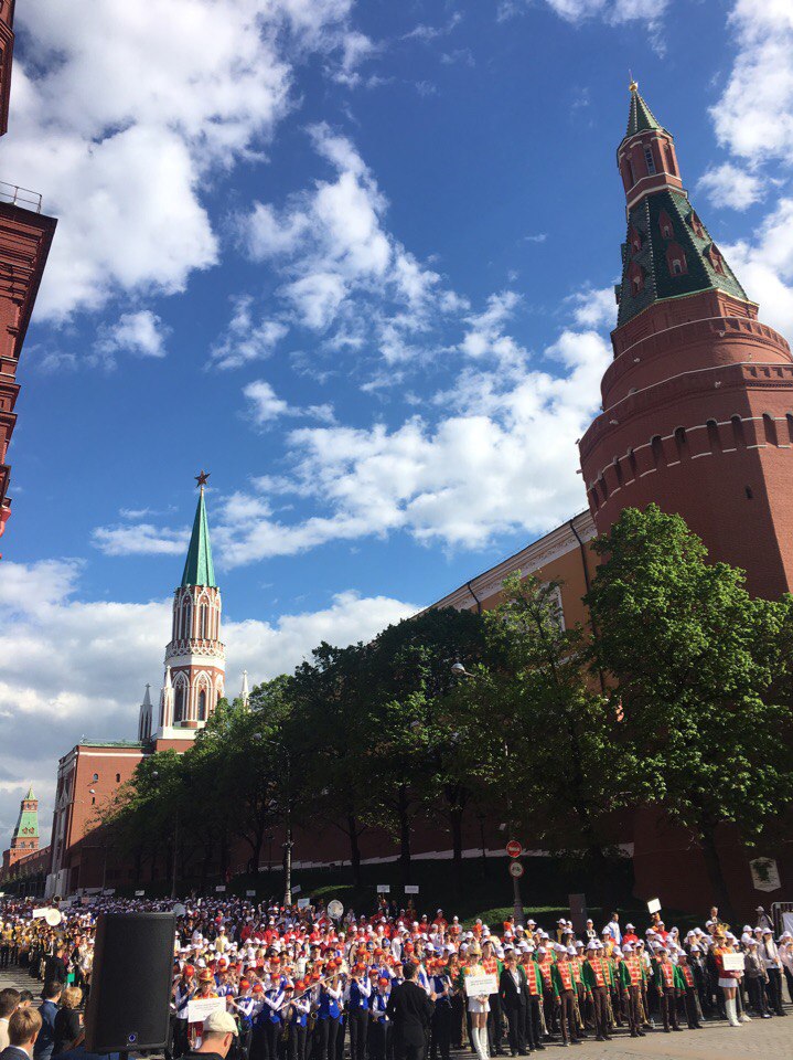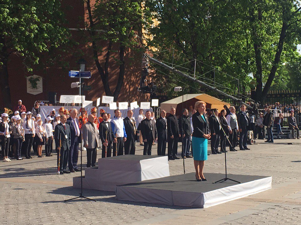 Детский духовой оркестр, состоящий из 1200 участников смотра детских коллективов исполнил известные мелодии у стен Московского Кремля. С приветствиями к юным музыкантам обратились Заместитель председателя Правительства РФ Ольга Голодец и Министр культуры России, Председатель РВИО Владимир Мединский.
