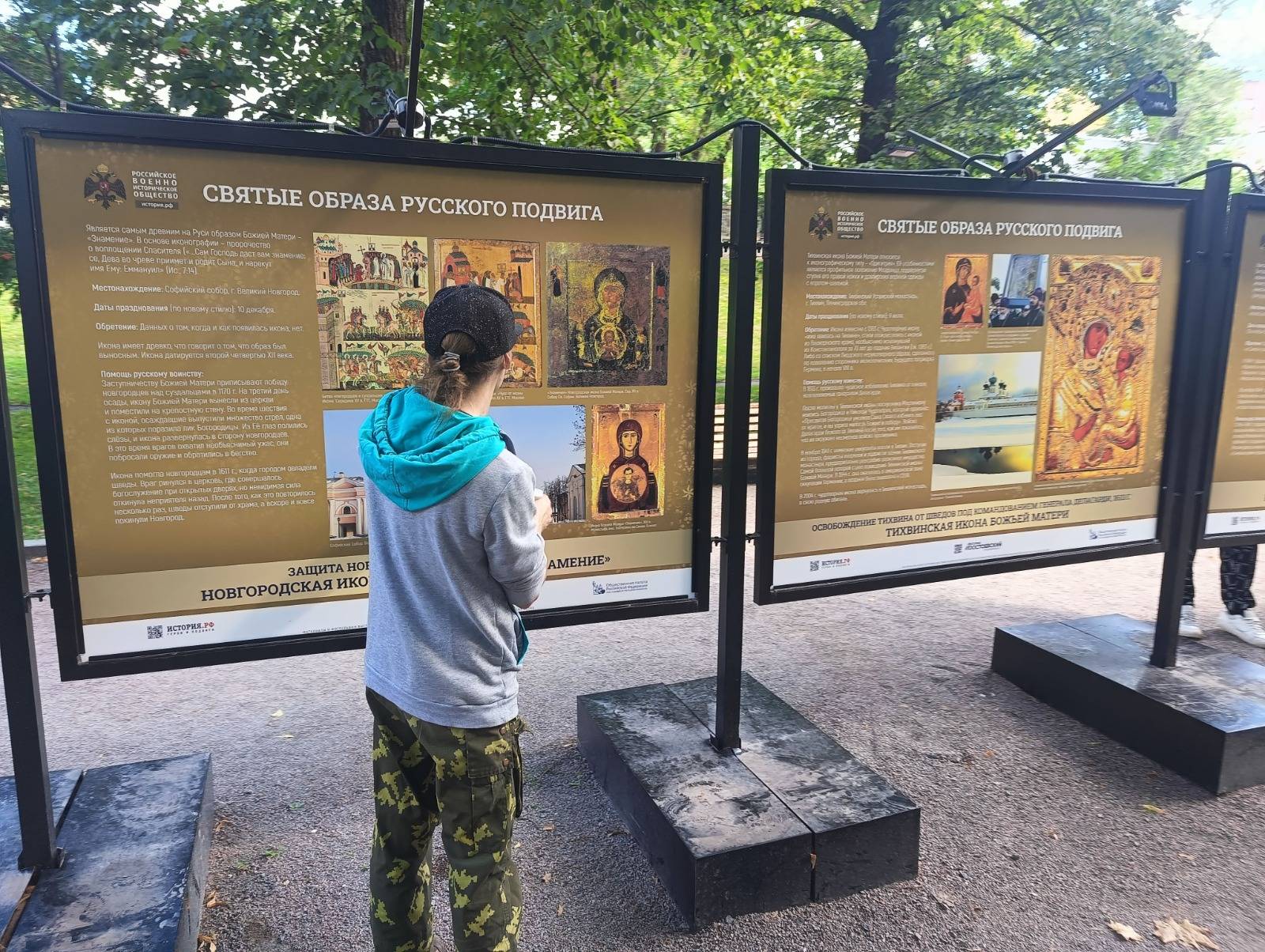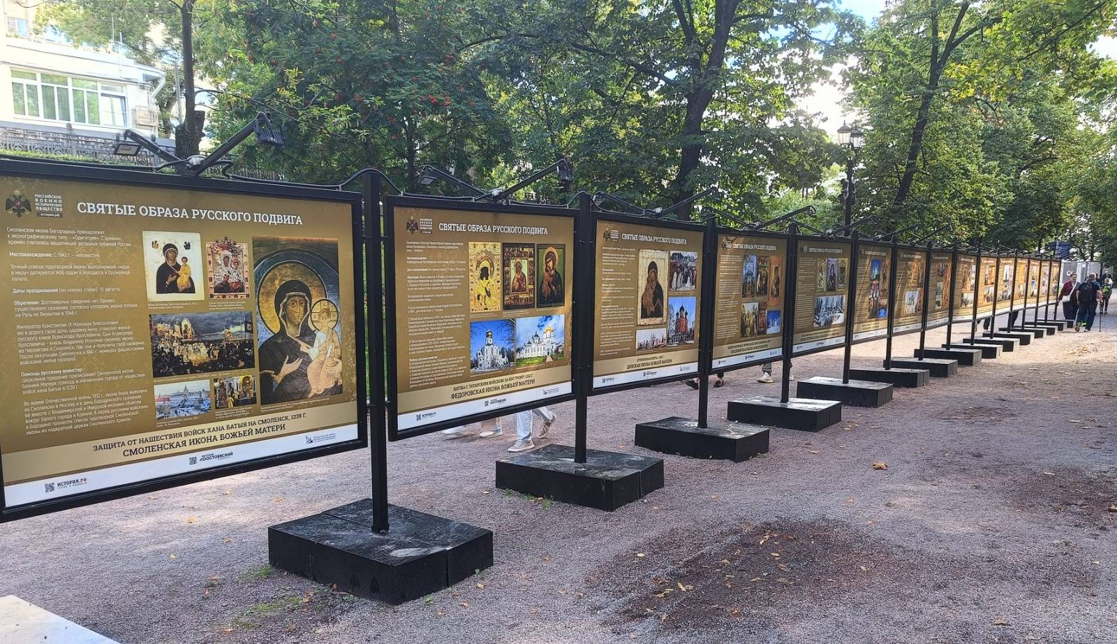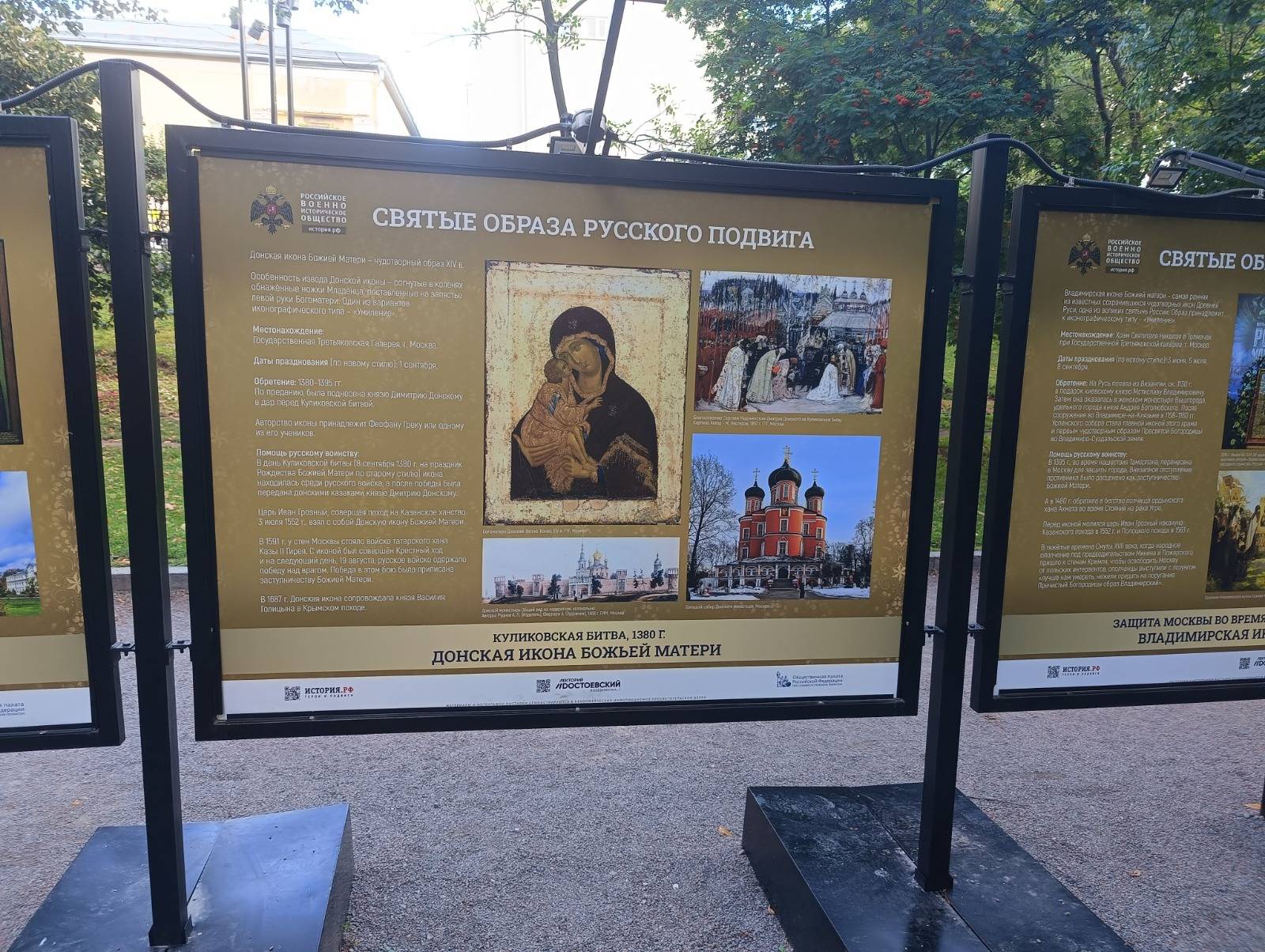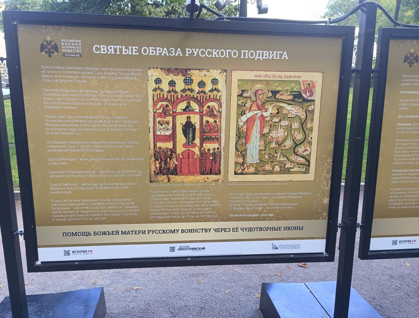 На Гоголевском бульваре в Москве начала работу уличная экспозиция РВИО «Святые образа русского подвига», посвященная иконам Божией Матери, способствовавшим победам русского воинства на полях сражений.