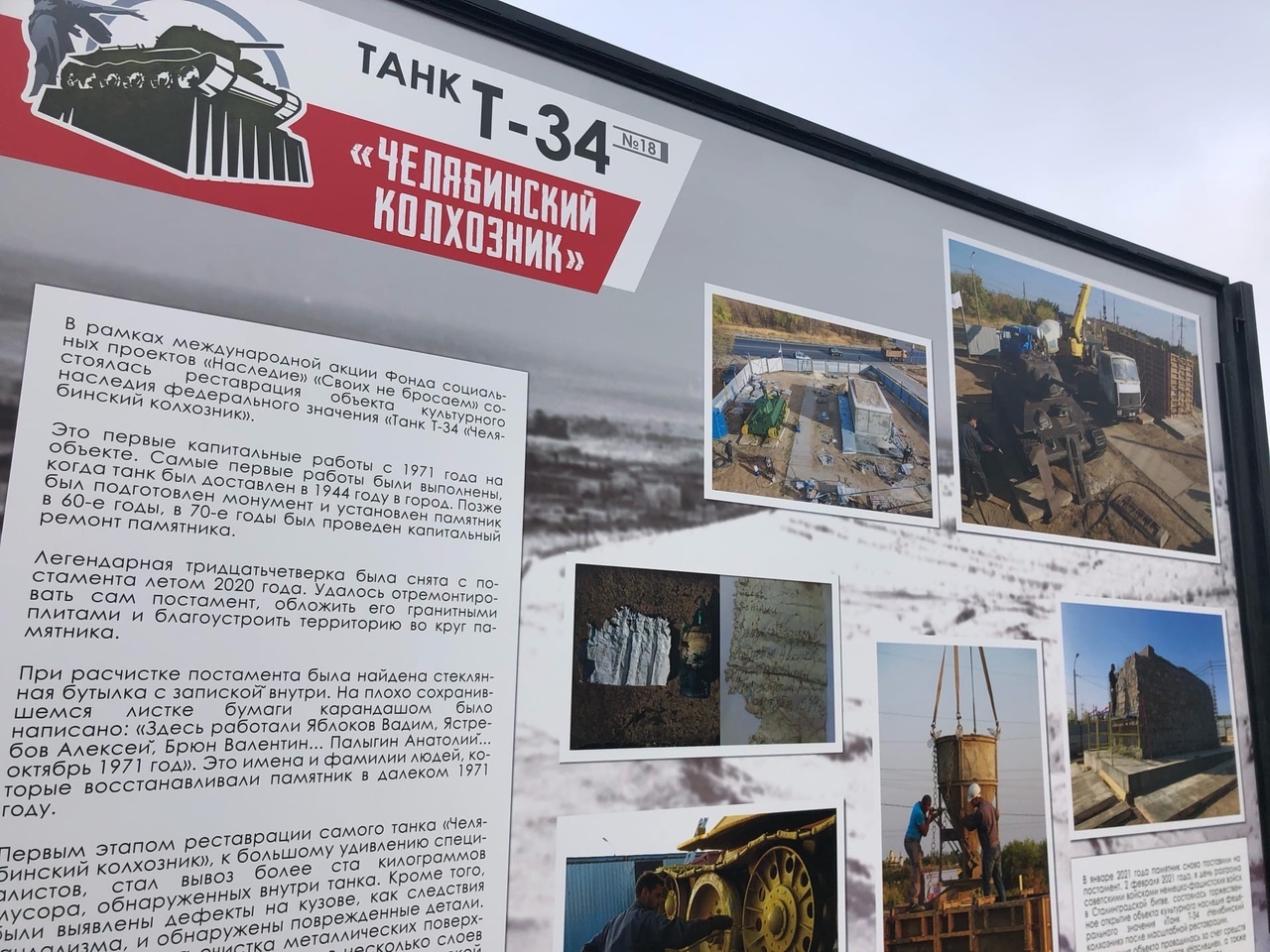 В день 78-й годовщины Победы в Сталинградской битве на северо-западном склоне Мамаева кургана (историческом месте соединения войск 21-й и 62-й армий) открыт после масштабной реставрации один из «защитников» города-героя: танк Т-34 «Челябинский колхозник».