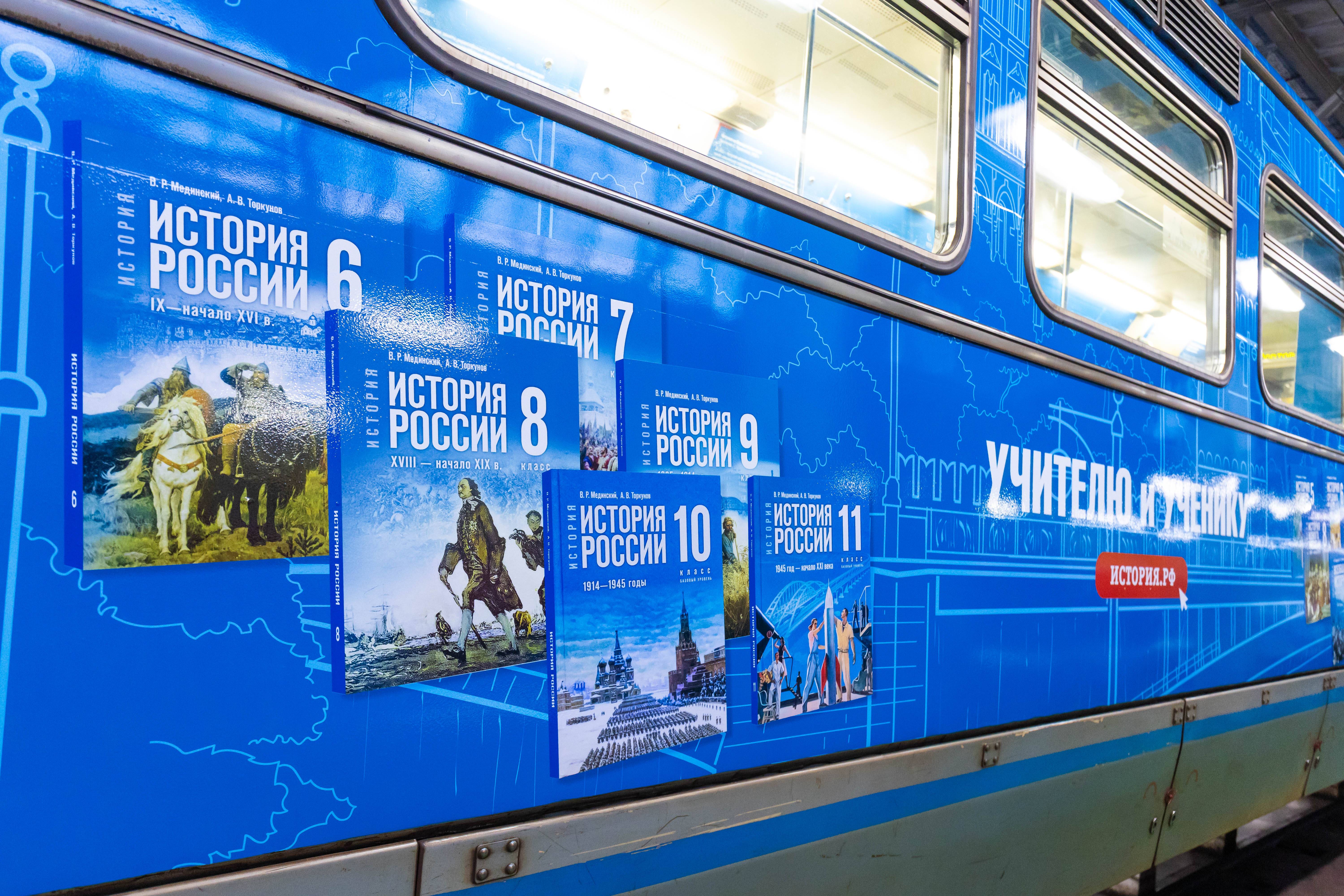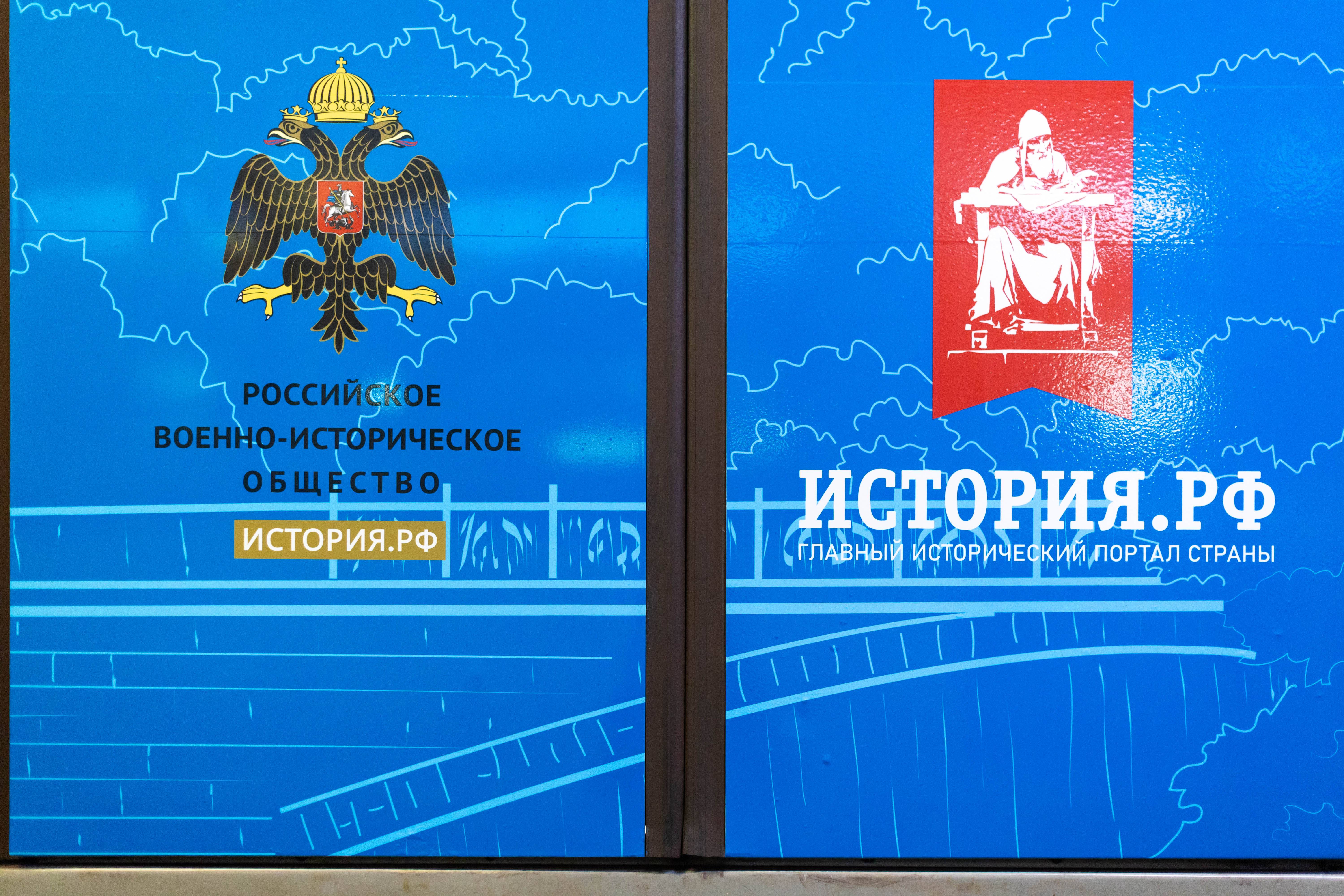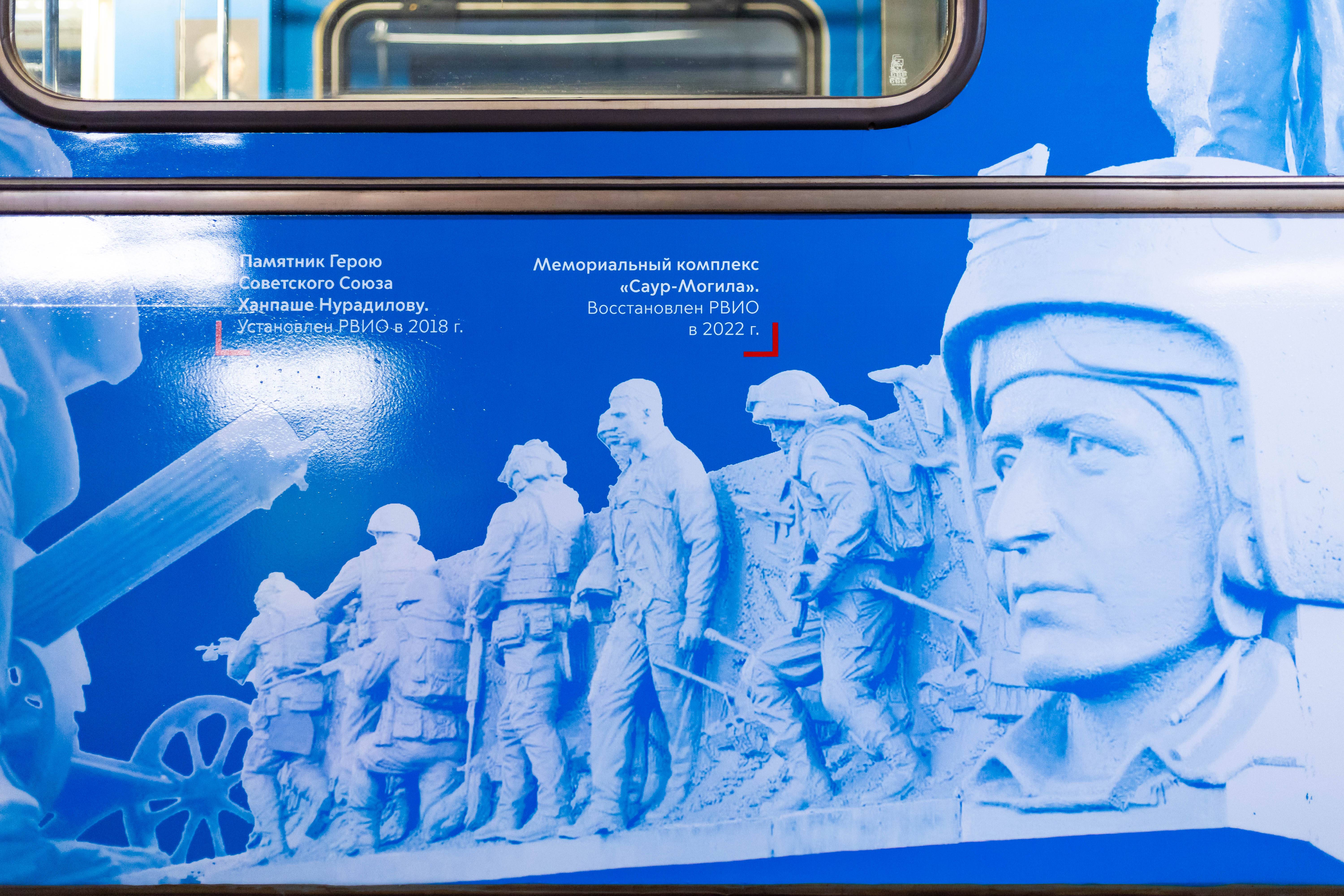 Российское военно-историческое общество совместно с Московским метрополитеном запустили новый тематический поезд. В его оформление вошли изображения новых учебников истории, а также мемориалов, установленных или отреставрированных РВИО: Саур-Могила, Ржевский мемориал Советскому солдату, Князь Александр Невский с дружиной, памятник Героям Первой мировой войны,