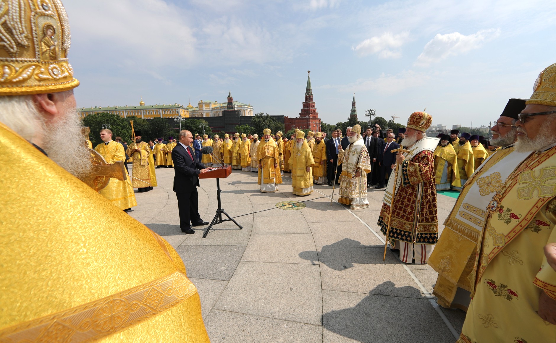 Патриаршая литургия впервые прошла на Соборной площади Кремля под открытым небом. Молитвенную радость разделили Патриарх Московский и всея Руси Кирилл, Патриарх Александрийский и всея Африки Феодор, а также несколько тысяч верующих со всей страны. По окончании службы глава государства присоединился к крестному ходу и вместе с верующими прошёл до Боровицкой площади к памятнику святому равноапостольному князю Владимиру.