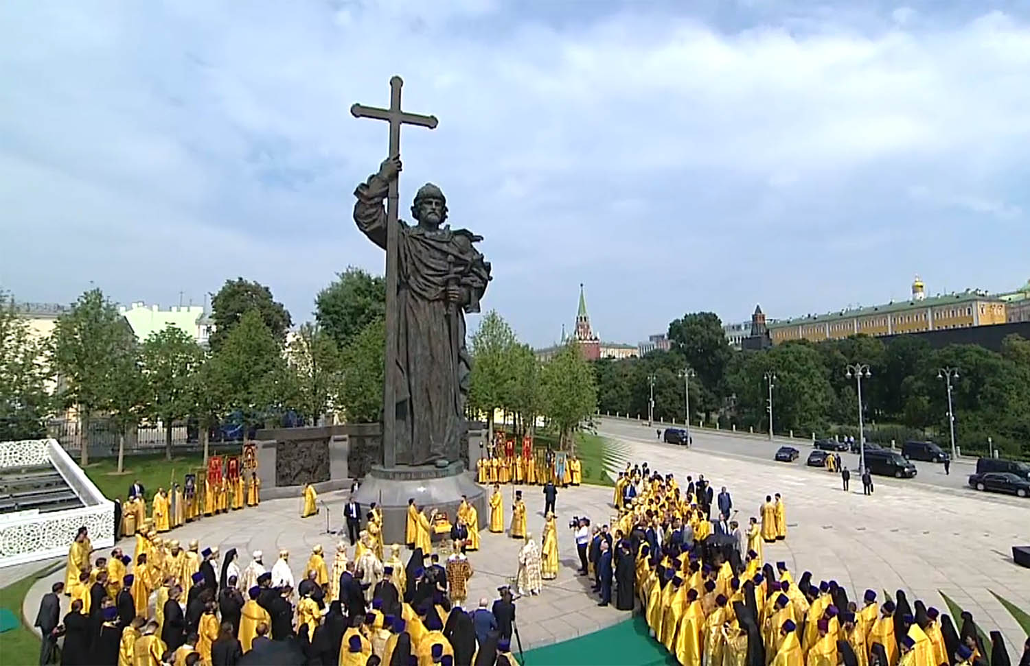 У памятника князю Владимиру состоялся праздничный молебен, на котором присутствовали полномочный представитель Президента в Центральном федеральном округе Игорь Щёголев, мэр Москвы Сергей Собянин, Министр культуры Российской Федерации, Председатель РВИО Владимир Мединский.